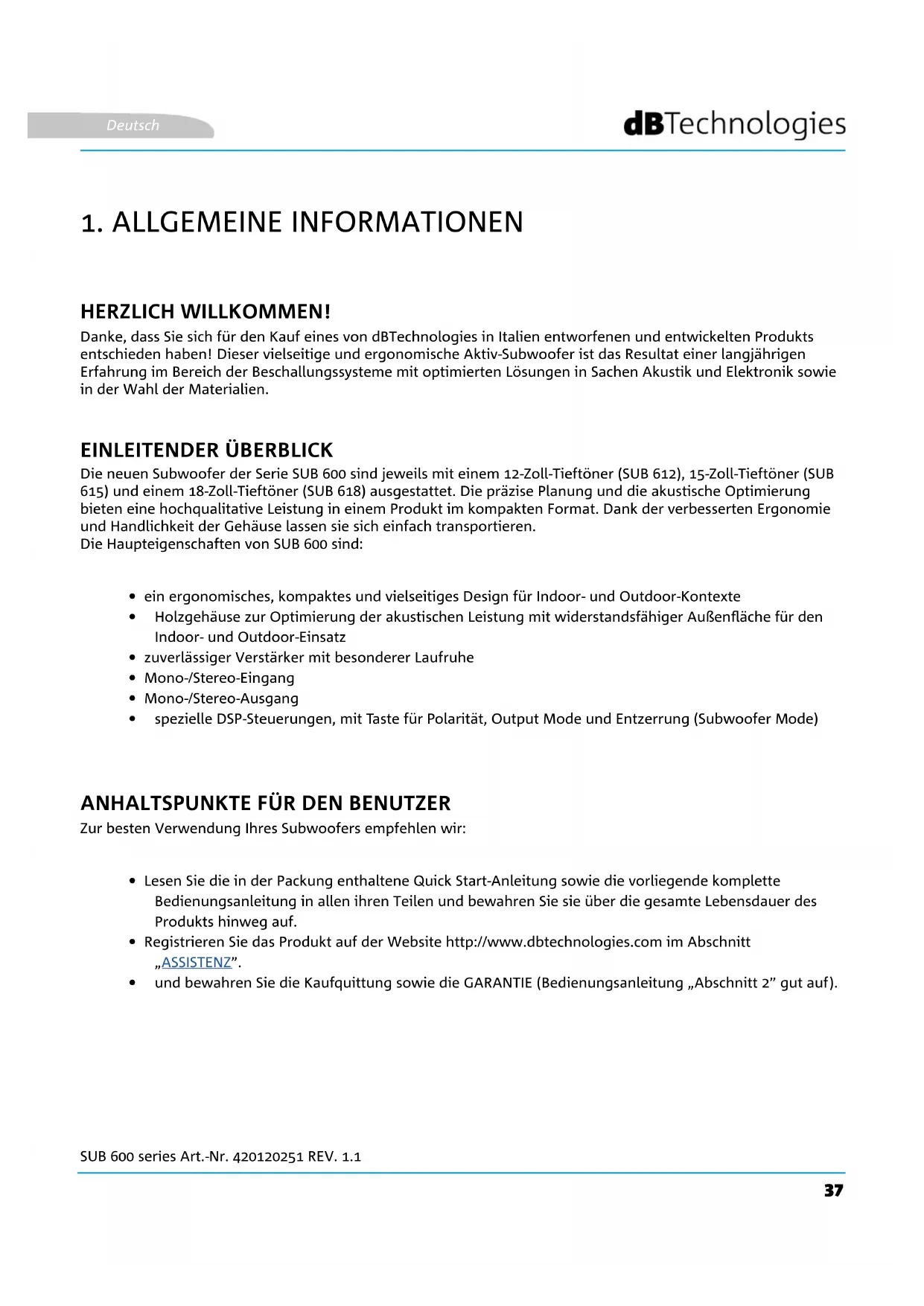 Danke, dass Sie sich für den Kauf eines von dBTechnologies in Italien entworfenen und entwickelten Produkte entschieden haben! Dieser vielseitige und ergonomische Aktiv-Subwoofer ist das Resultat einer langjährigen Erfahrung im Bereich der Beschallungssysteme mit optimierten Lösungen in Sachen Akustik und Elektronik sowie in der Wahl der Materialien.