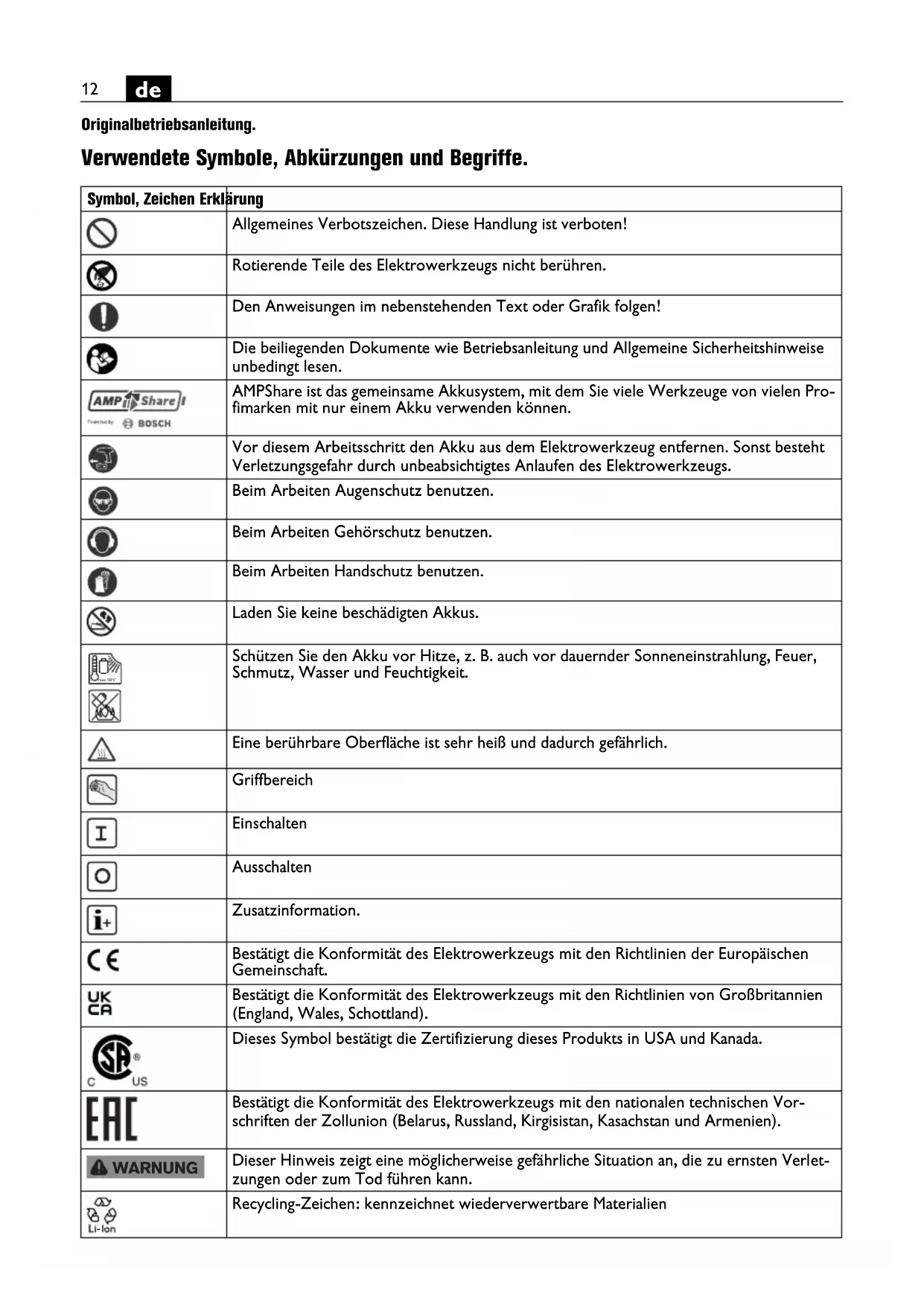 Originalbetriebsanleitung.Übersetzung der Originalbetriebsanleitung. Verwendete Symbole, Abkürzungen und Begriffe. Symbol, Zeichen Erklärung Allgemeines Verbotszeichen. Diese Handlung ist verboten! Rotierende Teile des Elektrowerkzeugs nicht berühren. Den Anweisungen im nebenstehenden Text oder Grafik folgen! Die beiliegenden Dokumente wie Betriebsanleitung und Allgemeine Sicherheitshinweise unbedingt lesen. AMPShare ist das gemeinsame Akkusystem, mit dem Sie viele Werkzeuge von vielen Pro- fimarken mit nur einem Akku verwenden können. Vor diesem Arbeitsschritt den Akku aus dem Elektrowerkzeug entfernen. Sonst besteht Verletzungsgefahr durch unbeabsichtigtes Anlaufen des Elektrowerkzeugs. Beim Arbeiten Augenschutz benutzen. Beim Arbeiten Gehörschutz benutzen. Beim Arbeiten Handschutz benutzen. Laden Sie keine beschädigten Akkus. Schützen Sie den Akku vor Hitze, z. B. auch vor dauernder Sonneneinstrahlung, Feuer, Schmutz, Wasser und Feuchtigkeit. Eine berührbare Oberfläche ist sehr heiß und dadurch gefährlich. Griffbereich Einschalten Ausschalten Zusatzinformation. Bestätigt die Konformität des Elektrowerkzeugs mit den Richtlinien der Europäischen Gemeinschaft. Bestätigt die Konformität des Elektrowerkzeugs mit den Richtlinien von Großbritannien (England, Wales, Schottland). Dieses Symbol bestätigt die Zertifizierung dieses Produkts in USA und Kanada. Bestätigt die Konformität des Elektrowerkzeugs mit den nationalen technischen Vor- schriften der Zollunion (Belarus, Russland, Kirgisistan, Kasachstan und Armenien). Dieser Hinweis zeigt eine möglicherweise gefährliche Situation an, die zu ernsten Verlet- zungen oder zum Tod führen kann. Recycling-Zeichen: kennzeichnet wiederverwertbare Materialien max.50°C WARNUNG13
