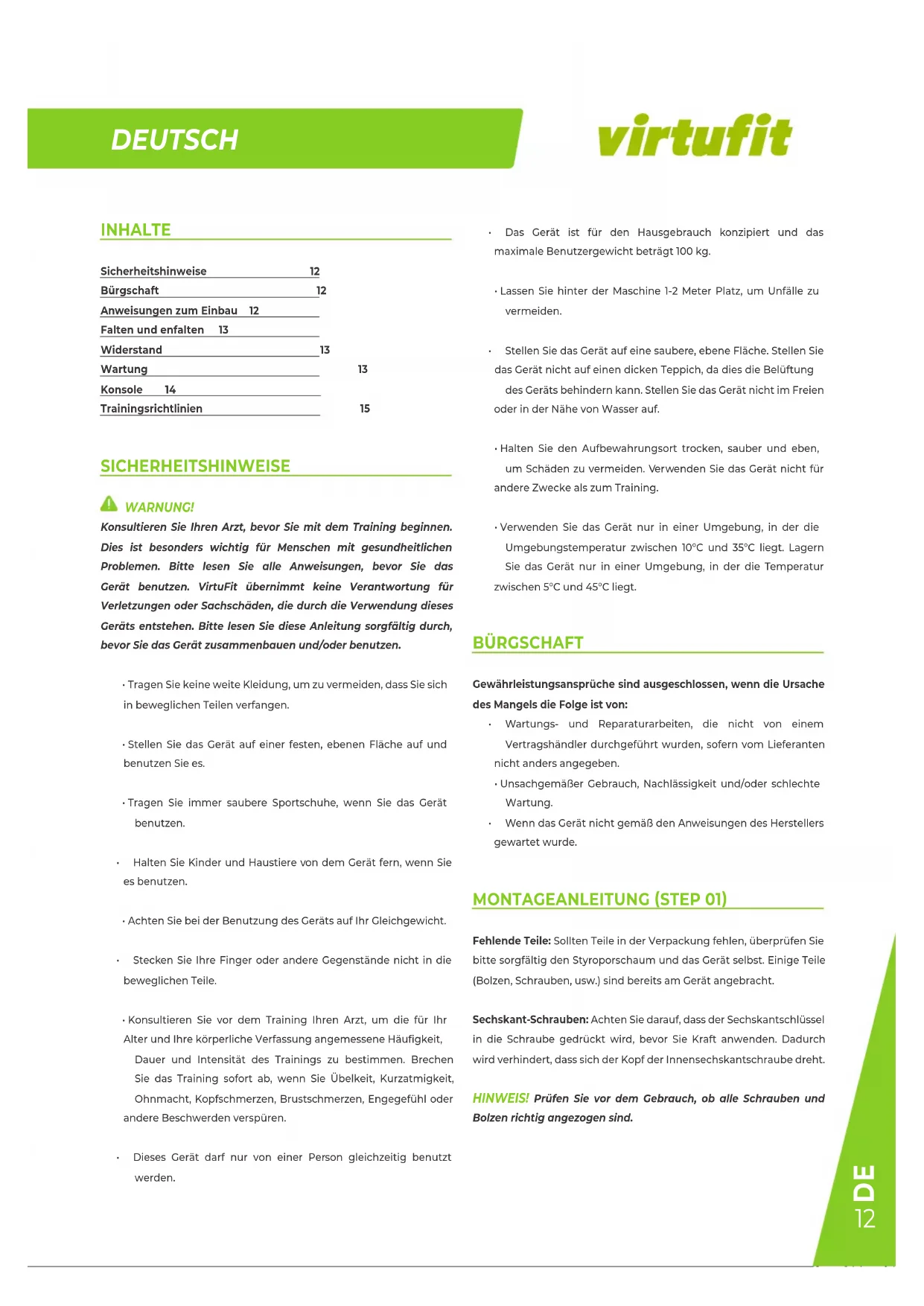 Konsultieren Sie ihren Arzt, bevor Sie mit dem Training beginnen. Dies ist besonderss wichtig für Menschen mit gesundheitlichen Problemen.itte lessen Si alle Anweisungen,behvor Sie das Gerat benutzen.VirtuFit ubernimmt keine Verantwortung fur Verletzungen oder Sachschaden, die durch die Verwendung diesera Gerats entstehen.itte lessen Si diese Anleitung sorgfaltig durch, bevor Sie das Gerat zusammenbauen und/oder benutzen.