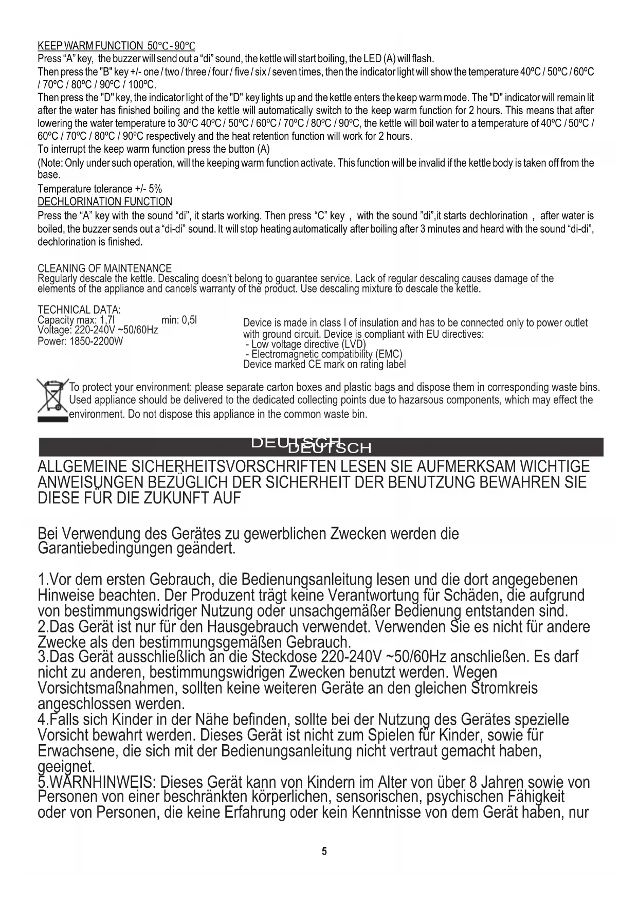 Bei Verwendung des Gerätes zu gewerblichen Zwecken werden die Garantiebedingungen geändert. 5.WARNHINWEIS: Dieses Gerät kann von Kindern im Alter von über 8 Jahren sowie von Personen von einer beschränkten körperlichen, sensorischen, psychischen Fähigkeit oder von Personen, die keine Erfahrung oder kein Kenntnisse von dem Gerät haben, nur 4.Falls sich Kinder in der Nähe befinden, sollte bei der Nutzung des Gerätes spezielle Vorsicht bewahrt werden. Dieses Gerät ist nicht zum Spielen für Kinder, sowie für Erwachsene, die sich mit der Bedienungsanleitung nicht vertraut gemacht haben, geeignet. 3.Das Gerät ausschließlich an die Steckdose 220-240V ~50/60Hz anschließen. Es darf nicht zu anderen, bestimmungswidrigen Zwecken benutzt werden. Wegen Vorsichtsmaßnahmen, sollten keine weiteren Geräte an den gleichen Stromkreis angeschlossen werden. 2.Das Gerät ist nur für den Hausgebrauch verwendet. Verwenden Sie es nicht für andere Zwecke als den bestimmungsgemäßen Gebrauch. 1.Vor dem ersten Gebrauch, die Bedienungsanleitung lesen und die dort angegebenen Hinweise beachten. Der Produzent trägt keine Verantwortung für Schäden, die aufgrund von bestimmungswidriger Nutzung oder unsachgemäßer Bedienung entstanden sind. (Note: Only under such operation, will the keeping warm function activate. This function will be invalid if the kettle body is taken off from the base. Then press the "D" key, the indicator light of the "D" key lights up and the kettle enters the keep warm mode. The "D" indicator will remain lit after the water has finished boiling and the kettle will automatically switch to the keep warm function for 2 hours. This means that after lowering the water temperature to 30ºC 40ºC / 50ºC / 60ºC / 70ºC / 80ºC / 90ºC, the kettle will boil water to a temperature of 40ºC / 50ºC / 60ºC / 70ºC / 80ºC / 90ºC respectively and the heat retention function will work for 2 hours. Press the “A” key with the sound “di”, it starts working. Then press “C” key,with the sound ”di”,it starts dechlorination,after water is boiled, the buzzer sends out a “di-di” sound. It will stop heating automatically after boiling after 3 minutes and heard with the sound “di-di”, dechlorination is finished. Then press the "B" key +/- one / two / three / four / five / six / seven times, then the indicator light will show the temperature 40ºC / 50ºC / 60ºC / 70ºC / 80ºC / 90ºC / 100ºC.