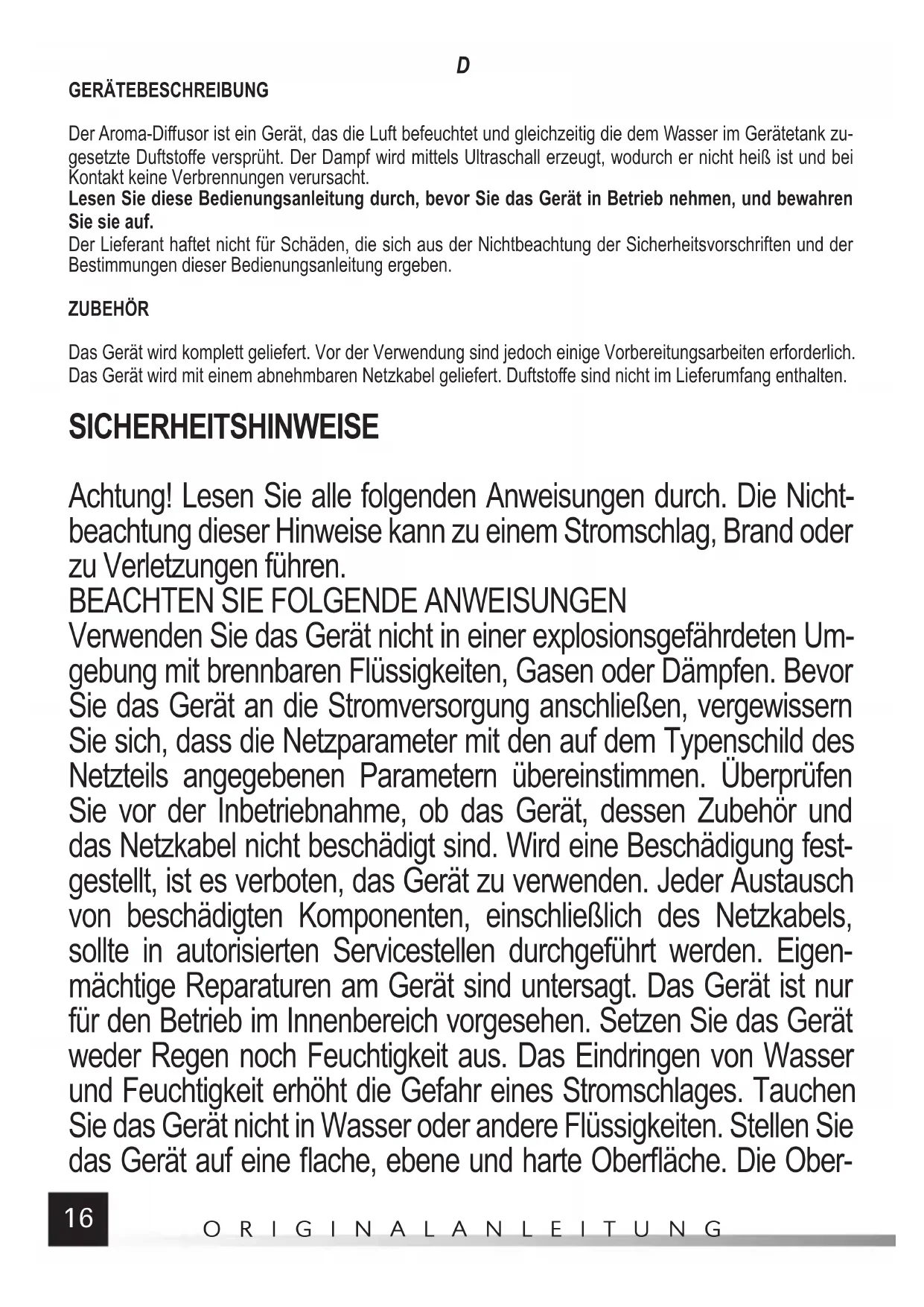 GERÄTEBESCHREIBUNG Der Aroma-Diff usor ist ein Gerät, das die Luft befeuchtet und gleichzeitig die dem Wasser im Gerätetank zu- gesetzte Duftstoff e versprüht. Der Dampf wird mittels Ultraschall erzeugt, wodurch er nicht heiß ist und bei Kontakt keine Verbrennungen verursacht. Lesen Sie diese Bedienungsanleitung durch, bevor Sie das Gerät in Betrieb nehmen, und bewahren Sie sie auf. Der Lieferant haftet nicht für Schäden, die sich aus der Nichtbeachtung der Sicherheitsvorschriften und der Bestimmungen dieser Bedienungsanleitung ergeben. ZUBEHÖR Das Gerät wird komplett geliefert. Vor der Verwendung sind jedoch einige Vorbereitungsarbeiten erforderlich. Das Gerät wird mit einem abnehmbaren Netzkabel geliefert. Duftstoff e sind nicht im Lieferumfang enthalten. SICHERHEITSHINWEISE Achtung! Lesen Sie alle folgenden Anweisungen durch. Die Nicht- beachtung dieser Hinweise kann zu einem Stromschlag, Brand oder zu Verletzungen führen.