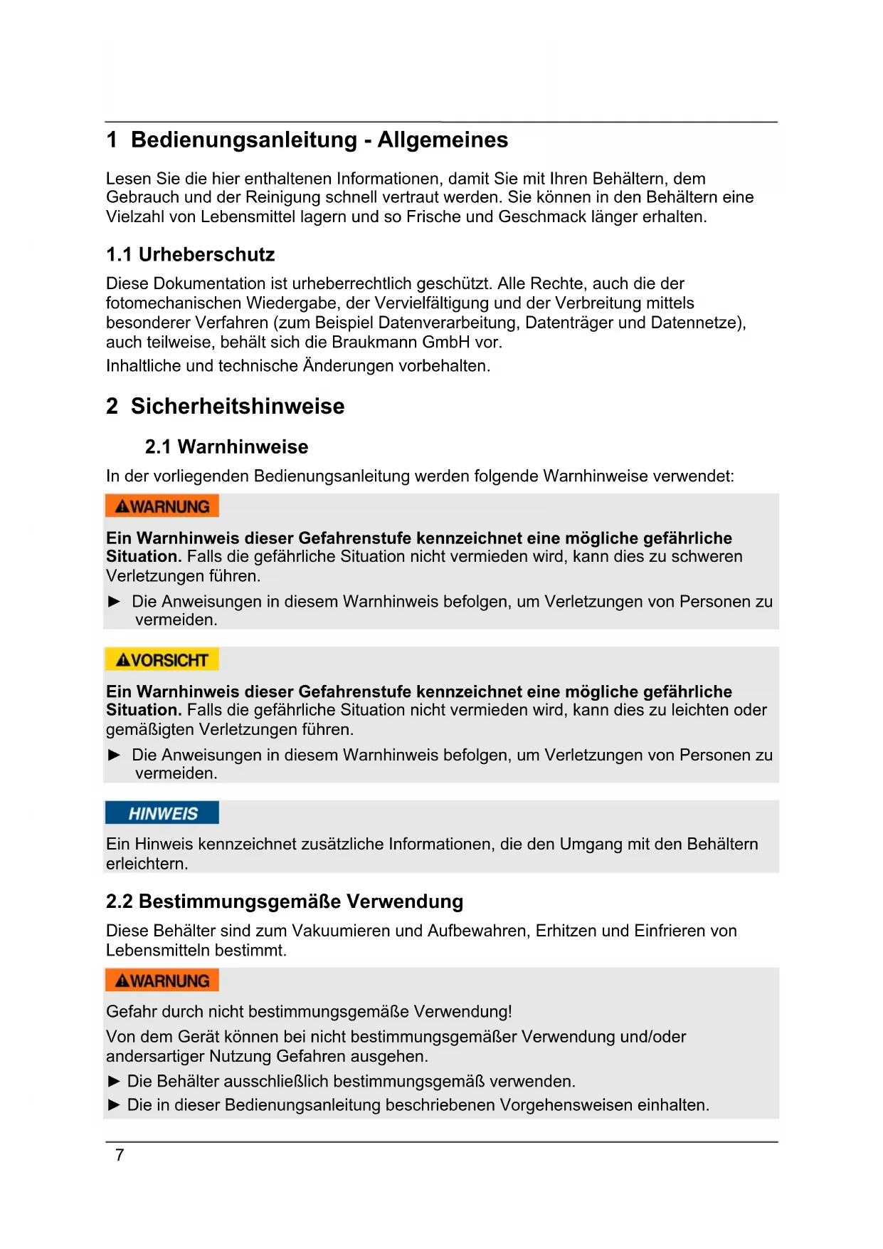 Diese Behälter sind zum Vakuumieren und Aufbewahren, Erhitzen und Einfrieren von Lebensmitteln bestimmt. Gefahr durch nicht bestimmungsgemäße Verwendung! Von dem Gerät können bei nicht bestimmungsgemäßer Verwendung und/oder andersartiger Nutzung Gefahren ausgehen. ► Die Behälter ausschließlich bestimmungsgemäß verwenden. ► Die in dieser Bedienungsanleitung beschriebenen Vorgehensweisen einhalten.8