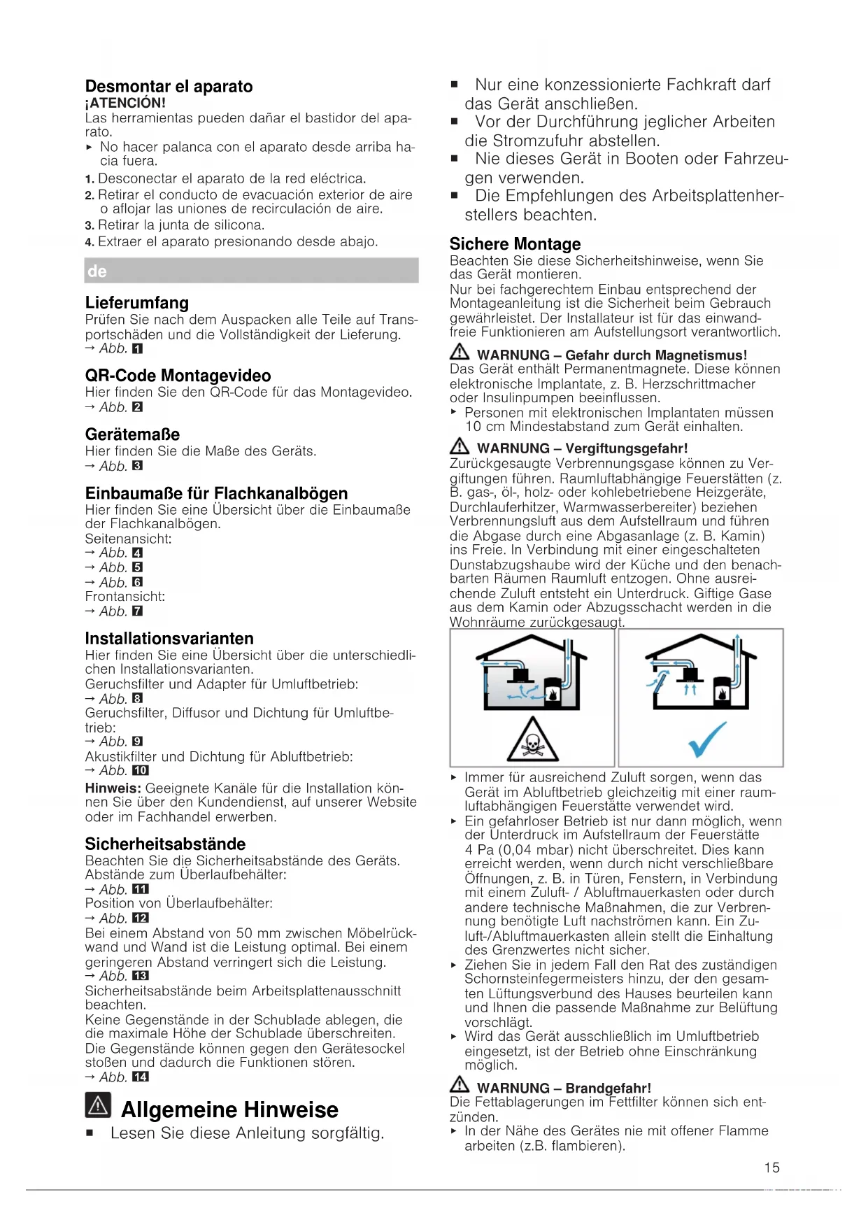 Personen mit elektronischen Implantaten müssen 10cm Mindestabstand zum Gerät einhalten. WARNUNG‒Vergiftungsgefahr! Zurückgesaugte Verbrennungsgase können zu Ver- giftungen führen. Raumluftabhängige Feuerstätten (z. B. gas-, öl-, holz- oder kohlebetriebene Heizgeräte, Durchlauferhitzer, Warmwasserbereiter) beziehen Verbrennungsluft aus dem Aufstellraum und führen die Abgase durch eine Abgasanlage (z. B. Kamin) ins Freie. In Verbindung mit einer eingeschalteten Dunstabzugshaube wird der Küche und den benach- barten Räumen Raumluft entzogen. Ohne ausrei- chende Zuluft entsteht ein Unterdruck. Giftige Gase aus dem Kamin oder Abzugsschacht werden in die Wohnräume zurückgesaugt.