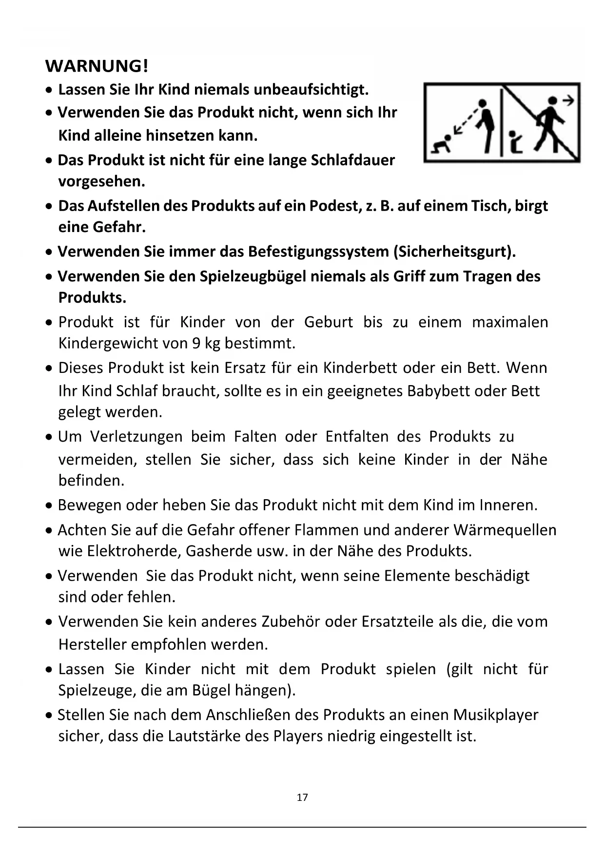 - Lassen Sie Kinder nicht mit dem Produkt spielen (gilt nicht für Spielzeuge, die am Bügel hängen).