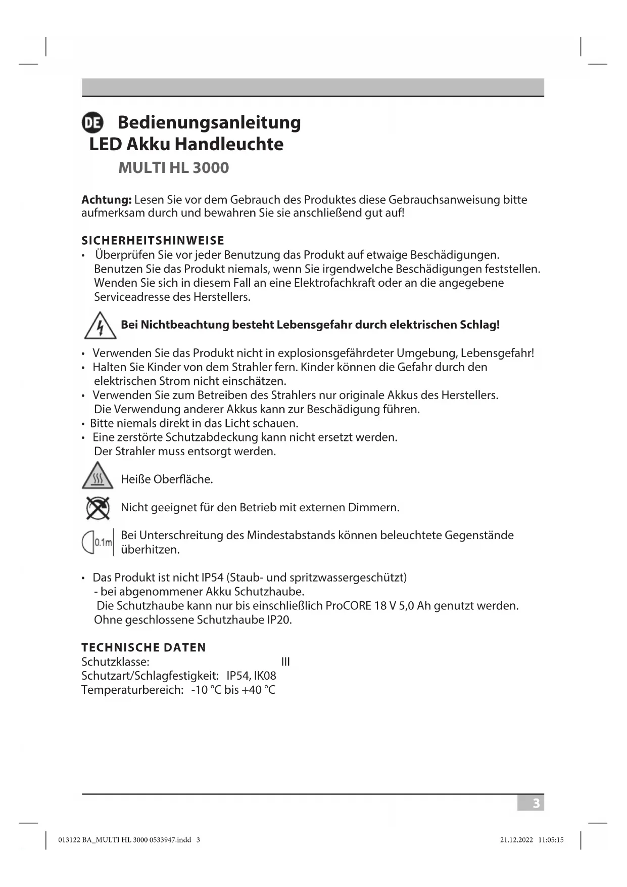 - Das Produkt ist nicht IP54 (Staub- und spritzwassergeschützt) - bei abgenommener Akku Schutzhaube. Die Schutzhaube kann nur bis einschließlich ProCORE 18 V 5,0 Ah genutzt werden. Ohne geschlossene Schutzhaube IP20. TECHNISCHE DATEN Schutzklasse: III Schutzart/Schlagfestigkeit: IP54, IK08 Temperaturbereich: -10 °C bis +40 °C 013122 BA_MULTI HL 3000 0533947.indd 3013122 BA_MULTI HL 3000 0533947.indd 3 21.12.2022 11:05:1521.12.2022 11:05:154 Bedienungsanleitung MULTI HL 3000 Typ: MULTI HL 3000 Kompatible Akkutypen: Eine Übersicht aller erhältlichen Adapter und den passenden Akkus nden Sie auf unserer Homepage www.brennenstuhl.com Max. projizierte Fläche: 183,63 cm