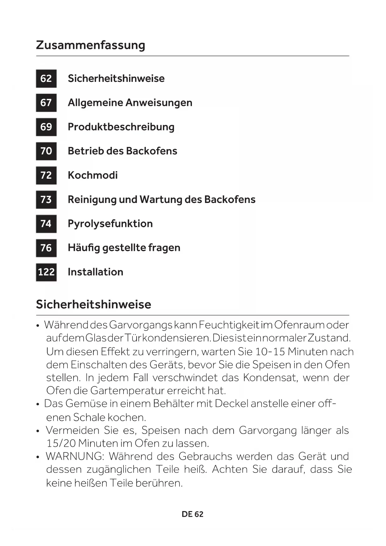Sicherheitshinweise Allgemeine Anweisungen Produktbeschreibung Betrieb des Backofens Kochmodi Reinigung und Wartung des Backofens Pyrolysefunktion Häug gestellte fragen Installation Zusammenfassung