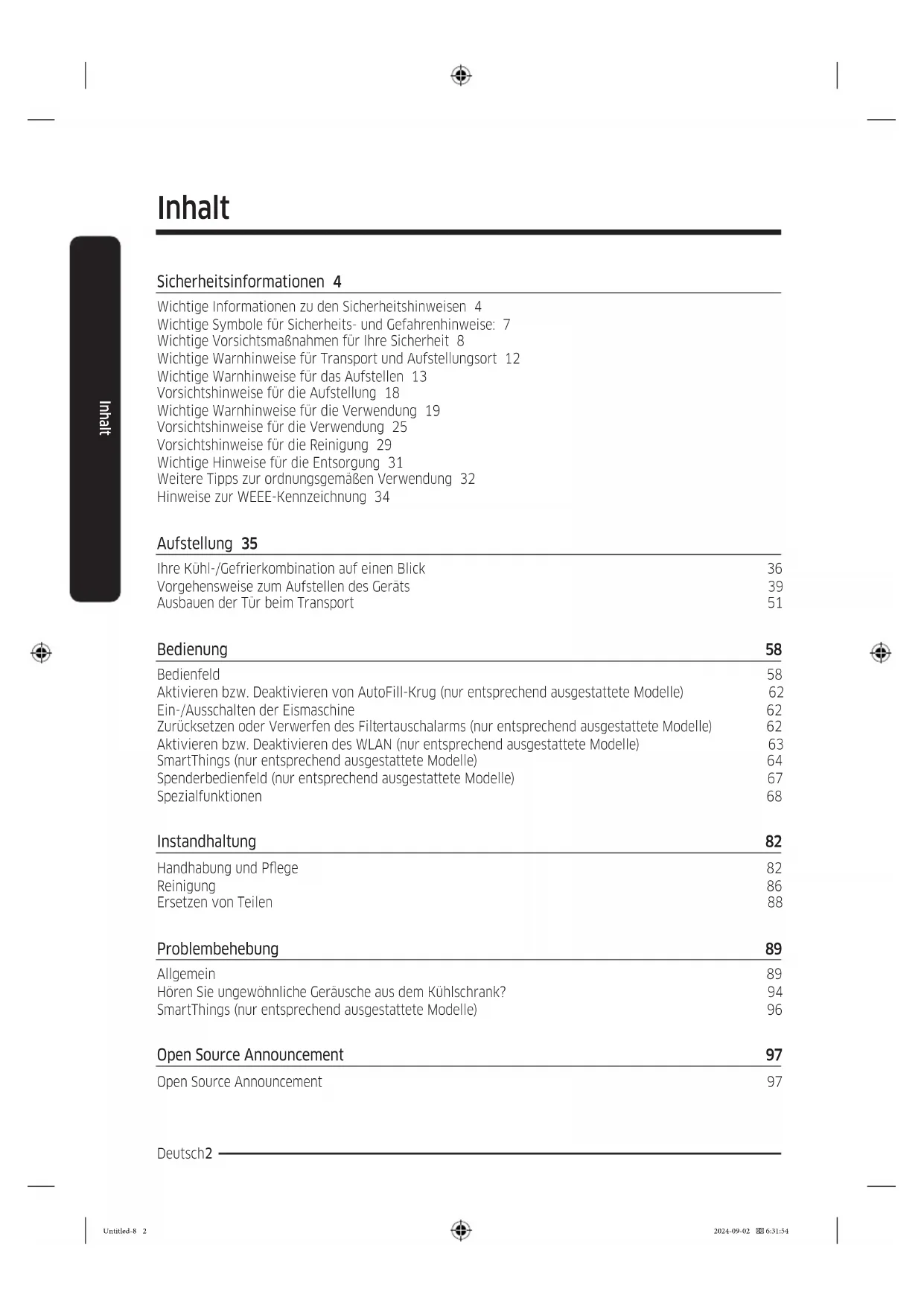 www.samsung.com/be/support (Dutch) www.samsung.com/be_fr/support (French) DA68-04434B-04 Untitled-7 104Untitled-7 104 2024-09-02 6:29:102024-09-02 6:29:10Kühl-/Gefrierkombination Benutzerhandbuch RS68A*/RS68C*/RS6G*/RS6E*/RH68B**/RH69B**/RH69C**/RH6AC**/ RH68D*/RH69D*/RS6H*/RS66D*/RS67A**/RS6JA**/RS66A**/RS6KA** SEBN Standgerät Untitled-8 1Untitled-8 1 2024-09-02 6:31:532024-09-02 6:31:53Deutsch2 Inhalt Inhalt Sicherheitsinformationen 4 Wichtige Informationen zu den Sicherheitshinweisen 4 Wichtige Symbole für Sicherheits- und Gefahrenhinweise: 7 Wichtige Vorsichtsmaßnahmen für Ihre Sicherheit 8 Wichtige Warnhinweise für Transport und Aufstellungsort 12 Wichtige Warnhinweise für das Aufstellen 13 Vorsichtshinweise für die Aufstellung 18 Wichtige Warnhinweise für die Verwendung 19 Vorsichtshinweise für die Verwendung 25 Vorsichtshinweise für die Reinigung 29 Wichtige Hinweise für die Entsorgung 31 Weitere Tipps zur ordnungsgemäßen Verwendung 32 Hinweise zur WEEE-Kennzeichnung 34 Aufstellung 35 Ihre Kühl-/Gefrierkombination auf einen Blick 36 Vorgehensweise zum Aufstellen des Geräts 39 Ausbauen der Tür beim Transport 51 Bedienung 58 Bedienfeld 58 Aktivieren bzw. Deaktivieren von AutoFill-Krug (nur entsprechend ausgestattete Modelle) 62 Ein-/Ausschalten der Eismaschine 62 Zurücksetzen oder Verwerfen des Filtertauschalarms (nur entsprechend ausgestattete Modelle) 62 Aktivieren bzw. Deaktivieren des WLAN (nur entsprechend ausgestattete Modelle) 63 SmartThings (nur entsprechend ausgestattete Modelle) 64 Spenderbedienfeld (nur entsprechend ausgestattete Modelle) 67 Spezialfunktionen 68 Instandhaltung 82 Handhabung und Pege 82 Reinigung 86 Ersetzen von Teilen 88 Problembehebung 89 Allgemein 89 Hören Sie ungewöhnliche Geräusche aus dem Kühlschrank? 94 SmartThings (nur entsprechend ausgestattete Modelle) 96 Open Source Announcement 97 Open Source Announcement 97 Untitled-8 2Untitled-8 2 2024-09-02 6:31:542024-09-02 6:31:54Deutsch 3 Inhalt Anhang 98 Sicherheitshinweise 98 Installationsanleitung 98 Angaben zur Temperaturh 99 Modellinformationen und Bestellung von Ersatzteilen 103 Untitled-8 3Untitled-8 3 2024-09-02 6:31:542024-09-02 6:31:54Deutsch4 Sicherheitsinformationen Um sicherzustellen, dass Sie über die Eigenschaften und Funktionen Ihres neuen Geräts Bescheid wissen, müssen Sie diese Anleitung sorgfältig durchlesen, ehe Sie Ihre neue Kühl-/Gefrierkombination von Samsung in Betrieb nehmen. Wichtige Informationen zu den Sicherheitshinweisen