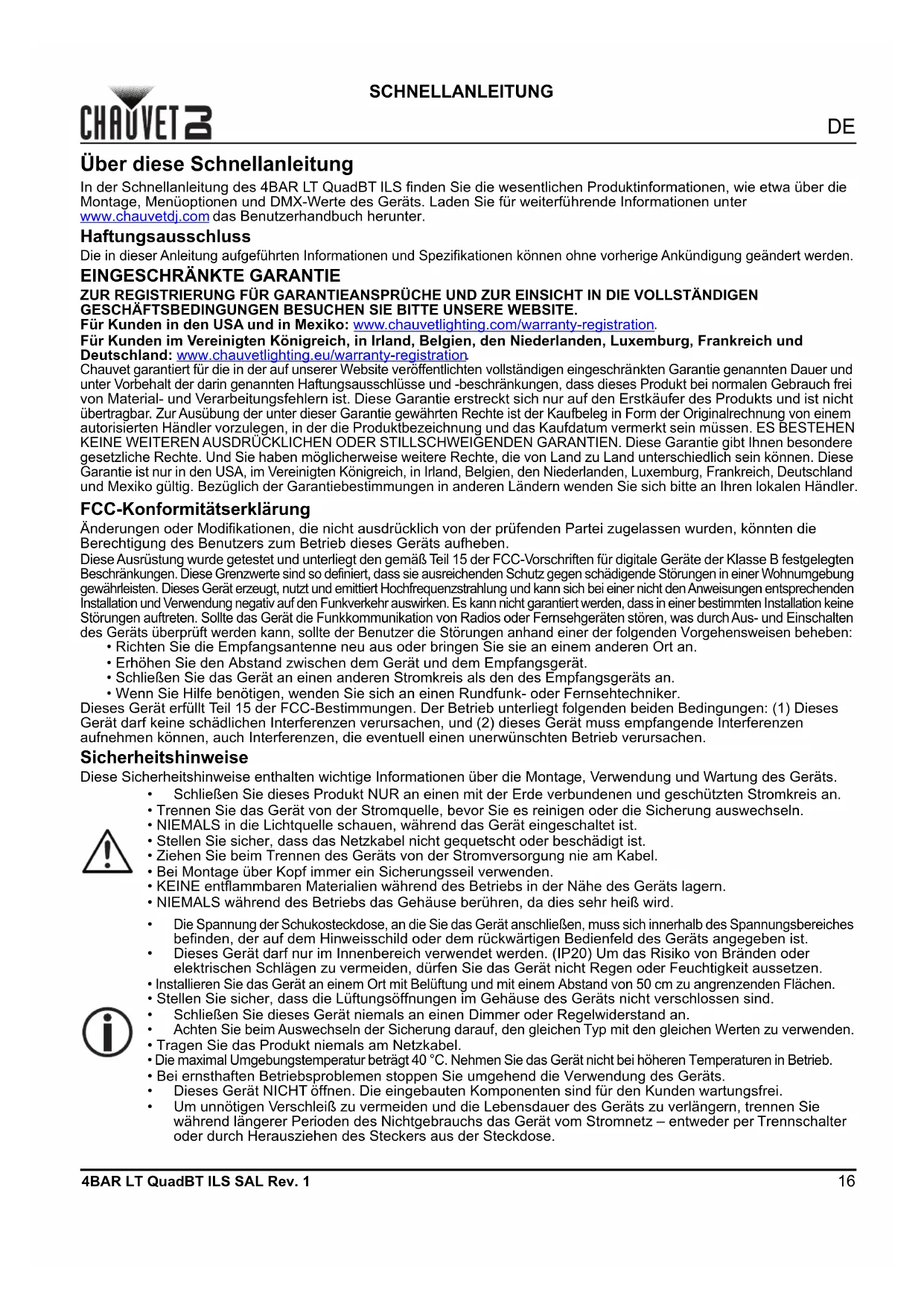 ZUR REGISTRIERUNG FÜR GARANTIEANSPRÜCHE UND ZUR EINSICHT IN DIE VOLLSTÄNDIGEN GESCHÄFTSBEDINGUNGEN BESUCHEN SIE BITTE UNSERE WEBSITE. Für Kunden in den USA und in Mexiko: www.chauvetlighting.com/warranty-registration