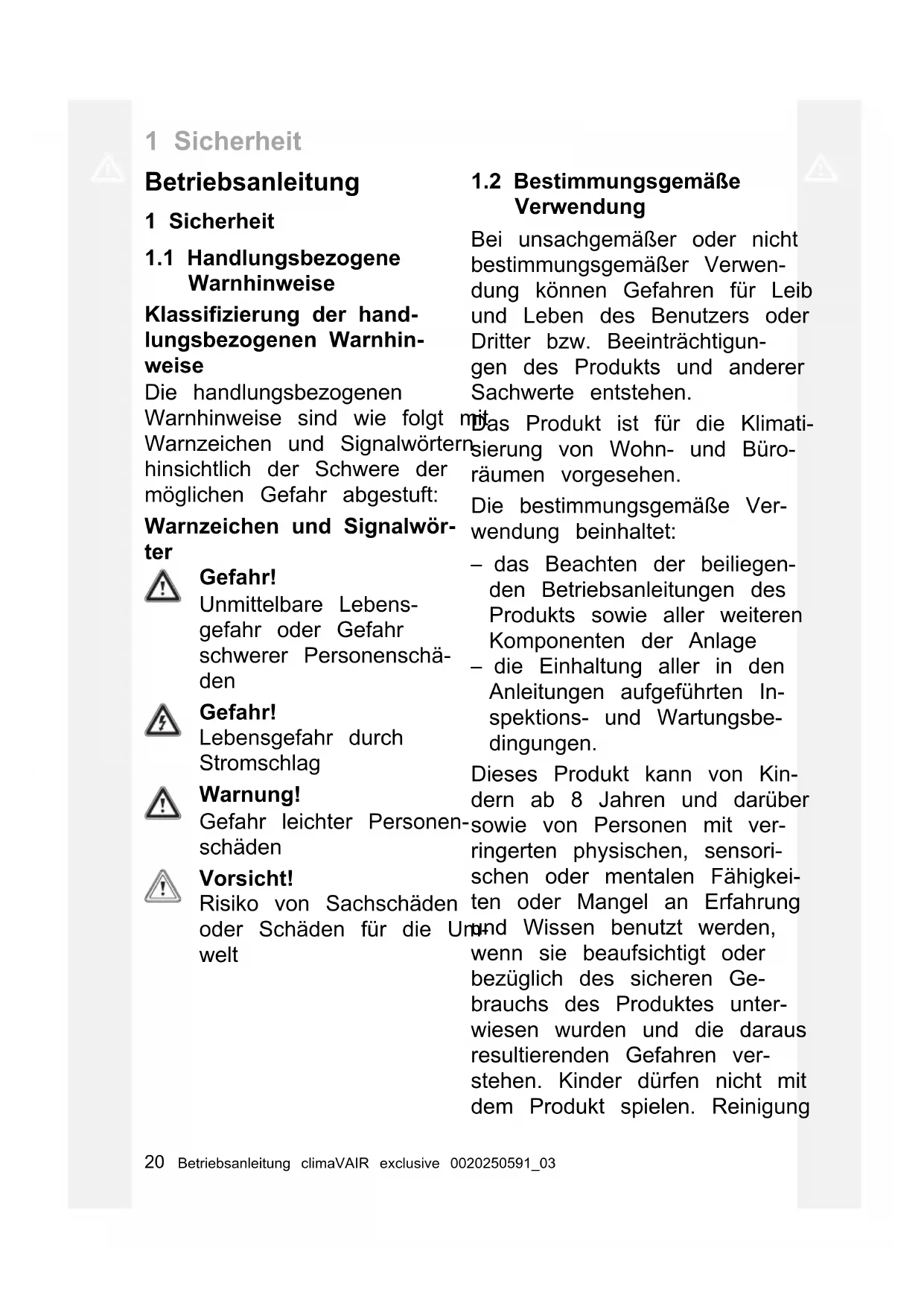Wifi-funktion............................................ 131 Sicherheit 20 Betriebsanleitung climaVAIR exclusive 0020250591_03 Betriebsanleitung 1 Sicherheit