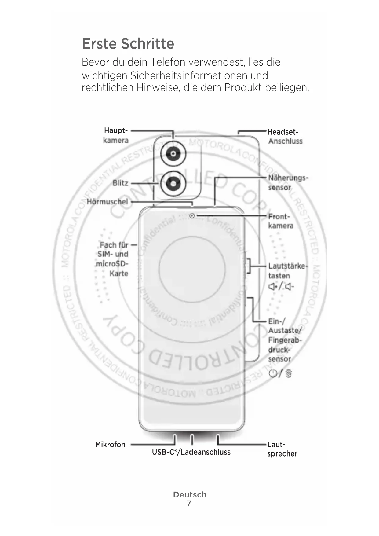- Apps abrufen: Tippe auf Play Store, um nach Apps zu suchen und diese herunterzuladen. Rechtliche Hinweise. Dieses Handbuch enthält wichtige rechtliche Hinweise sowie regulatorische Informationen und Sicherheitsinformationen, die du vor der Verwendung des Produkts lesen solltest. Um alle rechtlichen Hinweise zu lesen, wische auf dem Startbildschirm nach oben, tippe auf Einstellungen > und gib Rechtliche Hinweise ein oder besuche www.motorola.com/device-legal. Wasserabweisend. Das Telefon ist nicht wasserdicht. Um weitere Informationen über das wasserabweisende Telefondesign und die Pflege zu erhalten, wische nach oben und tippe auf Einstellungen > Hilfe. Aufladen und Akkusicherheit. Zur Vermeidung von Verbrennungen und sonstigen Verletzungen sollte der Akku des Telefons nur von einem von Motorola genehmigten Servicecenter oder vergleichbar geschultem Fachpersonal entfernt werden. Falls das Telefon nicht mehr reagiert, halte die Ein-/Aus-Taste gedrückt, bis sich der Bildschirm ausschaltet und das Telefon neu startet. Lade das Telefon mit einem kompatiblen Motorola-Ladegerät (möglicherweise nicht im Lieferumfang enthalten). Die Verwendung anderer Ladegeräte wird nicht empfohlen und kann die Ladeleistung beeinträchtigen. Lade das Telefon nicht bei Temperaturen unter -20°C (-4°F) oder über 45°C (113°F) auf. Ladegeräte, die nicht den geltenden nationalen Standards entsprechen, sind möglicherweise nicht sicher, können ein Todes- oder Verletzungsrisiko darstellen, eine längere Ladezeit benötigen oder Schäden am Produkt verursachen. Die geltenden Standards und weitere Informationen findest du im Abschnitt „Rechtliche Hinweise“ dieses Handbuchs oder besuche www.motorola.com/device-legal. Warnhinweis zur Verwendung mit hoher Lautstärke. Höre nicht über einen langen Zeitraum bei hoher Lautstärke, um mögliche Hörschäden zu verhindern. Es wird eine Warnung angezeigt, wenn das Headset den Schwellenwert für hohe Lautstärke erreicht. Tippe auf OK, um die Warnung zu verwerfen, oder drücke nach ein bis fünf Sekunden die Lauter-Taste, um die Meldung zu verwerfen und die Lautstärke weiter anzupassen. Entsorgung und Recycling. Wenn du Hilfe beim verantwortungsvollen Recyceln der Produkte und ihrer Verpackung benötigst, besuche www.motorola.com/recycling. Extreme Hitze oder Kälte. Verwende das Telefon nicht bei Temperaturen unter -20°C (-4°F) oder über 45°C (113°F). Lagere/ transportiere das Telefon nicht bei Temperaturen unter -20°C (-4°F) oder über 60°C (140°F). Haftungsausschlüsse. Funktionen, Dienste und Anwendungen sind netzwerkabhängig und u.U. nicht in allen Regionen verfügbar. Es können zusätzliche Bedingungen gelten und zusätzliche Gebühren anfallen. Die10 Produktspezifikationen und anderen Informationen aus diesem Handbuch wurden zum Zeitpunkt des Drucks für korrekt befunden. Motorola behält sich das Recht vor, Informationen ohne Ankündigung zu korrigieren oder zu ändern. Schiedsverfahren. Dein Kauf unterliegt einer Klausel über ein bindendes Schiedsverfahren. Weitere Informationen und Anweisungen zum Abwählen findest du in den rechtlichen Hinweisen, die im Lieferumfang deines Telefons enthalten sind. SAR-Informationen (auf dem E-Label). Um die Werte zur spezifischen Absorptionsrate (SAR) für dieses Gerät einzusehen, wische auf dem Startbildschirm des Telefons nach oben, tippe auf Einstellungen > und gib Behördliche Zulassungen ein, gib über die Wähltasten deines Telefons *#07# ein oder besuche www.motorola.com/sar. Unterstützte Frequenzen und Leistung (Modell XT2421-3). Dieses Telefon funktioniert mit den folgenden Frequenzen, je nach Standort und Netzwerkverfügbarkeit. Betriebsmodus Frequenzbereich MHz/Band Maximale nominale Sendeleistung dBm Bluetooth 2.400–2.483,5 20dBm EIRP WLAN 2.400–2.483,5 20dBm EIRP WLAN 5.150–5.250 23dBm EIRP WLAN 5.250–5.350 20dBm EIRP WLAN 5.470–5.725 20dBm EIRP WLAN 5.725–5.850 14dBm EIRP GNSS 1.559–1.610 k.A. FM-Empfang 87,5–108 k.A. GSM 3/5/8 33/30 UMTS 1/5/8 24 LTE 1/3/5/7/8/20/28/38/40/41 23 Urheberrecht und Marken. MOTOROLA, das Logo mit dem stilisierten M, MOTO und die MOTO-Markenfamilie sind Marken oder eingetragene Marken von Motorola Trademark Holdings, LLC. Google, Android, Google Play und andere zugehörige Marken und Logos sind Marken von Google LLC. Das microSD-Logo ist eine Marke von SD-3C, LLC. USB Type-C® und USB-C® sind eingetragene Marken von USB Implementers Forum. Alle sonstigen Produkt- oder Dienstleistungsnamen sind das Eigentum ihrer jeweiligen Inhaber. © 2023 Motorola Mobility LLC. Alle Rechte vorbehalten.