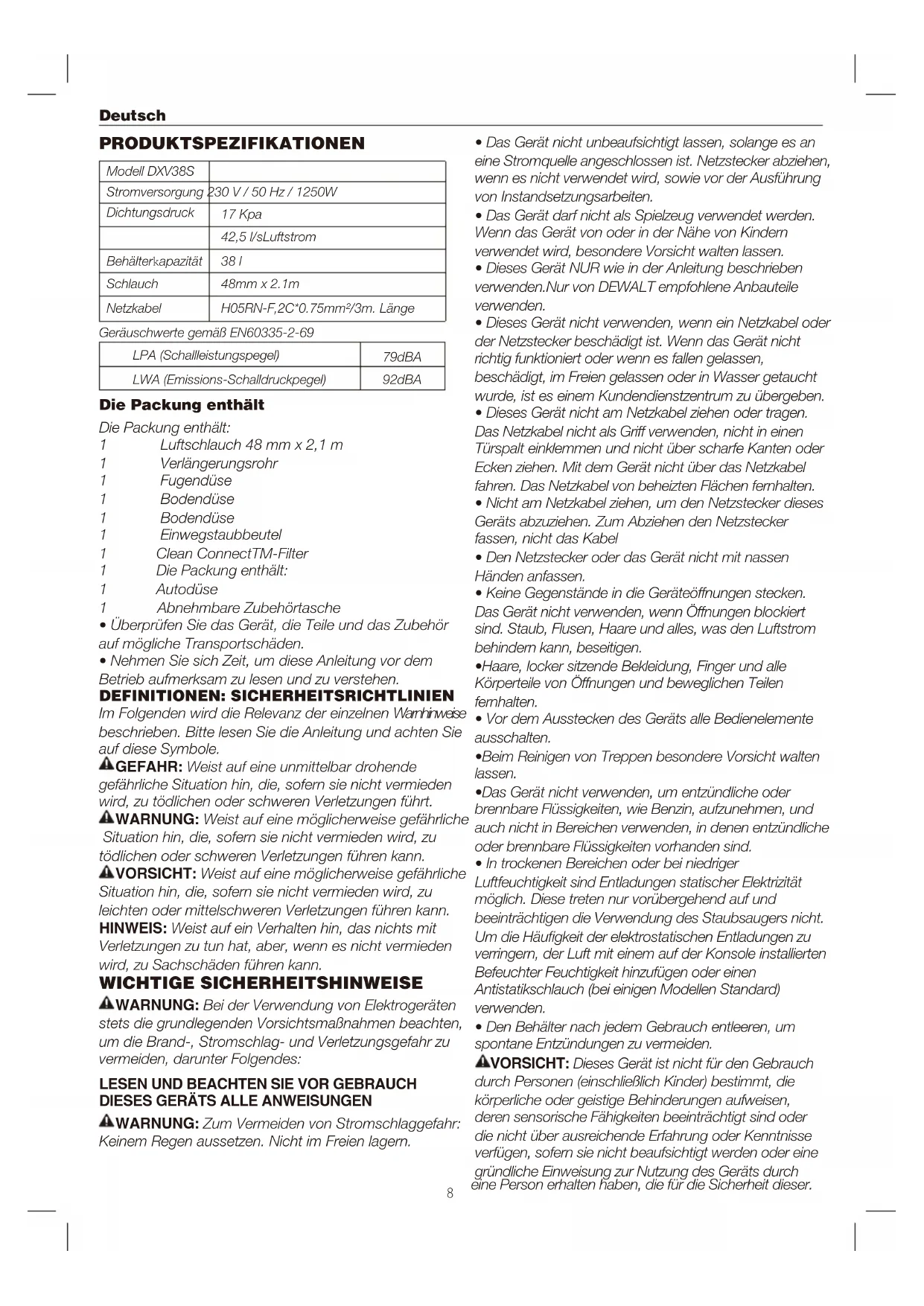 - Nehmen Sie sich Zeit, um diese Anleitung vor dem Betrieb aufmerksam zu lesen und zu verstehen. WICHTIGE SICHERHEITSHINWEISE Stromversorgung 230 V / 50 Hz / 1250W 17 Kpa 38 l 48mm x 2.1m 79dBA H05RN-F,2C*0.75mm²/3m. Länge Dichtungsdruck 42,5 l/sLuftstrom Behälterkapazität Schlauch LPA (Schallleistungspegel) LWA (Emissions-Schalldruckpegel) 92dBA Netzkabel Geräuschwerte gemäß EN60335-2-69 Im Folgenden wird die Relevanz der einzelnen Warnhinweise beschrieben. Bitte lesen Sie die Anleitung und achten Sie auf diese Symbole. GEFAHR: Weist auf eine unmittelbar drohende gefährliche Situation hin, die, sofern sie nicht vermieden wird, zu tödlichen oder schweren Verletzungen führt. WARNUNG: Weist auf eine möglicherweise gefährliche Situation hin, die, sofern sie nicht vermieden wird, zu tödlichen oder schweren Verletzungen führen kann. VORSICHT: Weist auf eine möglicherweise gefährliche Situation hin, die, sofern sie nicht vermieden wird, zu leichten oder mittelschweren Verletzungen führen kann. HINWEIS: Weist auf ein Verhalten hin, das nichts mit Verletzungen zu tun hat, aber, wenn es nicht vermieden wird, zu Sachschäden führen kann. WARNUNG: Bei der Verwendung von Elektrogeräten stets die grundlegenden Vorsichtsmaßnahmen beachten, um die Brand-, Stromschlag- und Verletzungsgefahr zu vermeiden, darunter Folgendes: WARNUNG: Zum Vermeiden von Stromschlaggefahr: Keinem Regen aussetzen. Nicht im Freien lagern. VORSICHT: Dieses Gerät ist nicht für den Gebrauch durch Personen (einschließlich Kinder) bestimmt, die körperliche oder geistige Behinderungen aufweisen, deren sensorische Fähigkeiten beeinträchtigt sind oder die nicht über ausreichende Erfahrung oder Kenntnisse verfügen, sofern sie nicht beaufsichtigt werden oder eine gründliche Einweisung zur Nutzung des Geräts durch eine Person erhalten haben, die für die Sicherheit dieser.