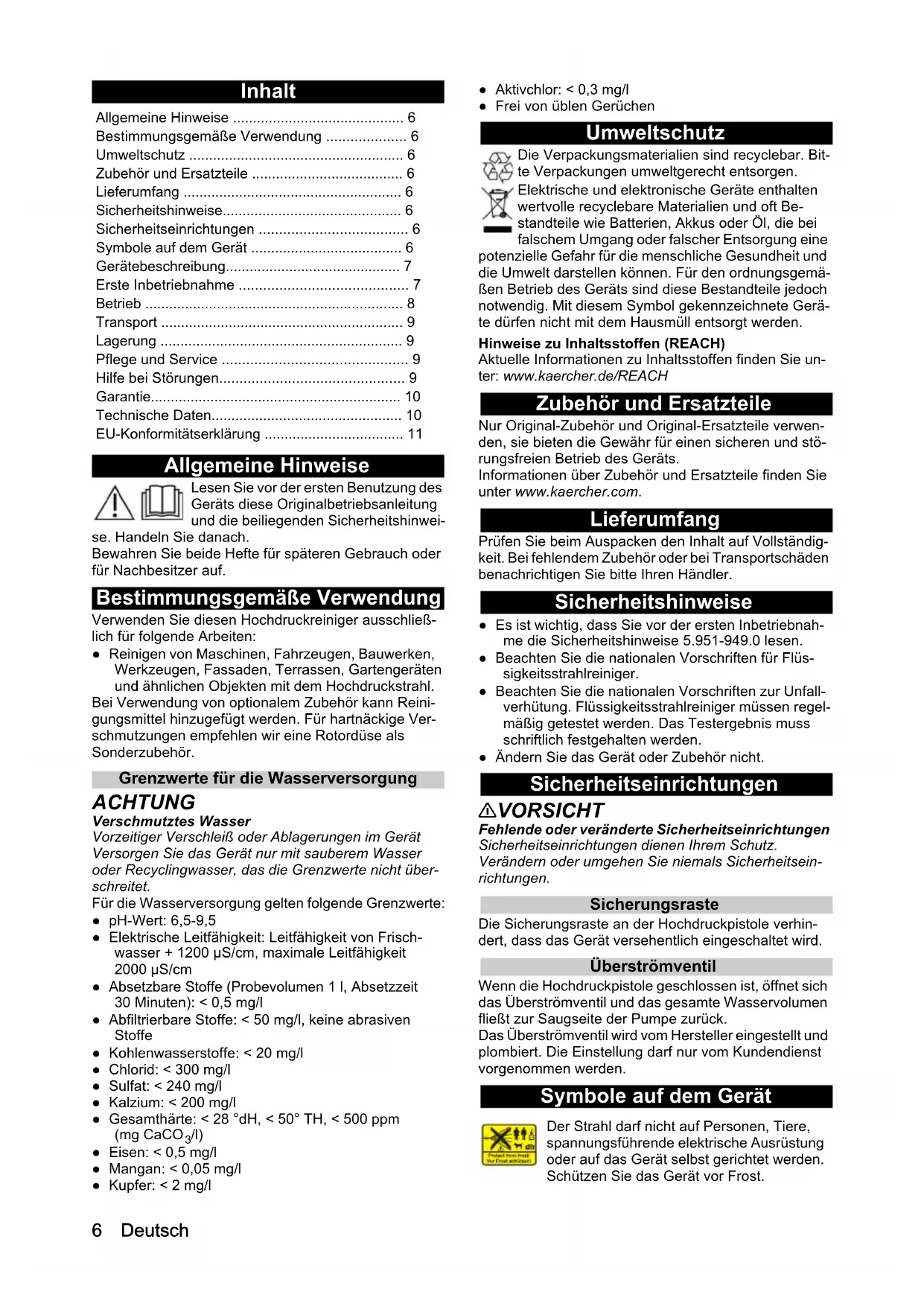 - /l) ● Eisen: < 0,5 mg/l ● Mangan: < 0,05 mg/l ● Kupfer: < 2 mg/l ● Aktivchlor: < 0,3 mg/l ● Frei von üblen Gerüchen Umweltschutz Die Verpackungsmaterialien sind recyclebar. Bit- te Verpackungen umweltgerecht entsorgen. Elektrische und elektronische Geräte enthalten wertvolle recyclebare Materialien und oft Be- standteile wie Batterien, Akkus oder Öl, die bei falschem Umgang oder falscher Entsorgung eine potenzielle Gefahr für die menschliche Gesundheit und die Umwelt darstellen können. Für den ordnungsgemä- ßen Betrieb des Geräts sind diese Bestandteile jedoch notwendig. Mit diesem Symbol gekennzeichnete Gerä- te dürfen nicht mit dem Hausmüll entsorgt werden. Hinweise zu Inhaltsstoffen (REACH) Aktuelle Informationen zu Inhaltsstoffen finden Sie un- ter: www.kaercher.de/REACH Zubehör und Ersatzteile Nur Original-Zubehör und Original-Ersatzteile verwen- den, sie bieten die Gewähr für einen sicheren und stö- rungsfreien Betrieb des Geräts. Informationen über Zubehör und Ersatzteile finden Sie unter www.kaercher.com. Lieferumfang Prüfen Sie beim Auspacken den Inhalt auf Vollständig- keit. Bei fehlendem Zubehör oder bei Transportschäden benachrichtigen Sie bitte Ihren Händler. Sicherheitshinweise ● Es ist wichtig, dass Sie vor der ersten Inbetriebnah- me die Sicherheitshinweise 5.951-949.0 lesen. ● Beachten Sie die nationalen Vorschriften für Flüs- sigkeitsstrahlreiniger. ● Beachten Sie die nationalen Vorschriften zur Unfall- verhütung. Flüssigkeitsstrahlreiniger müssen regel- mäßig getestet werden. Das Testergebnis muss schriftlich festgehalten werden. ● Ändern Sie das Gerät oder Zubehör nicht. Sicherheitseinrichtungen 몇 VORSICHT Fehlende oder veränderte Sicherheitseinrichtungen Sicherheitseinrichtungen dienen Ihrem Schutz. Verändern oder umgehen Sie niemals Sicherheitsein- richtungen. Sicherungsraste Die Sicherungsraste an der Hochdruckpistole verhin- dert, dass das Gerät versehentlich eingeschaltet wird. Überströmventil Wenn die Hochdruckpistole geschlossen ist, öffnet sich das Überströmventil und das gesamte Wasservolumen fließt zur Saugseite der Pumpe zurück. Das Überströmventil wird vom Hersteller eingestellt und plombiert. Die Einstellung darf nur vom Kundendienst vorgenommen werden. Symbole auf dem Gerät Allgemeine Hinweise p. 6