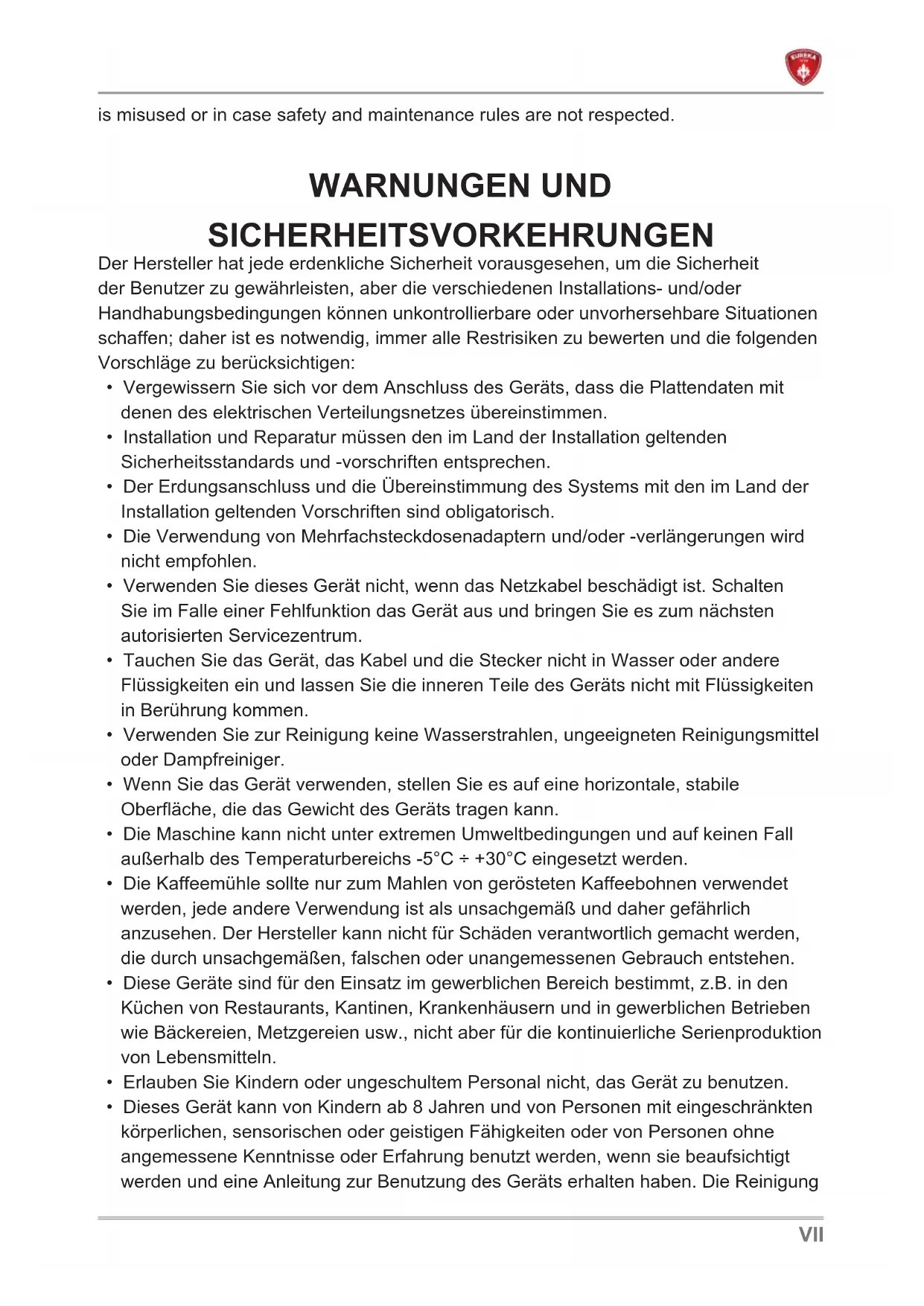 - Dieses Gerät kann von Kindern ab 8 Jahren und von Personen mit eingeschränkten körperlichen, sensorischen oder geistigen Fähigkeiten oder von Personen ohne angemessene Kenntnisse oder Erfahrung benutzt werden, wenn sie beaufsichtigt werden und eine Anleitung zur Benutzung des Geräts erhalten haben. Die ReinigungVIII darf nicht von Kindern ohne Aufsicht durchgeführt werden.