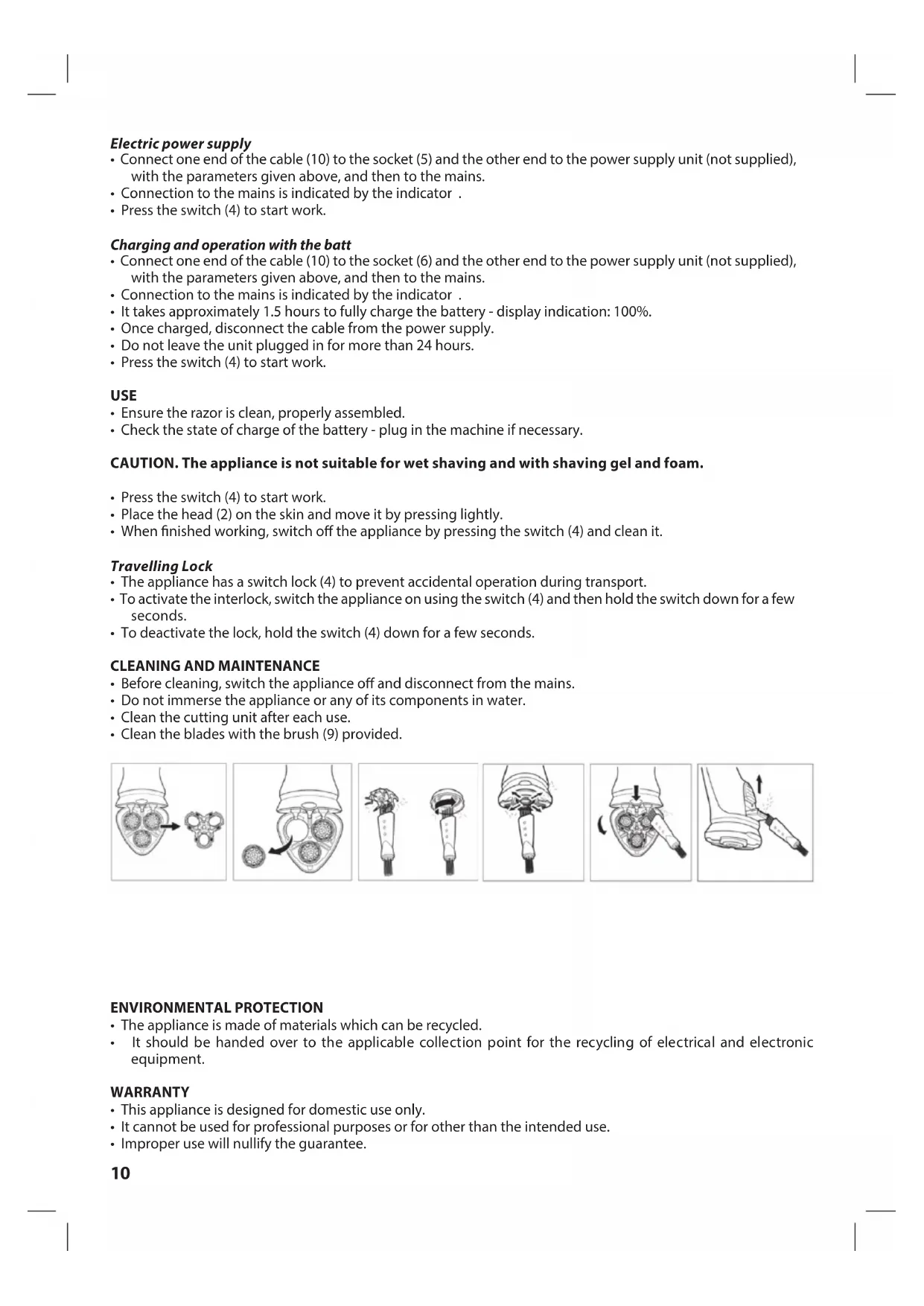 KOMPLETTBESCHREIBUNG1. Schutzkappe2. Drei Scherköpfe3. Knopf zum Kopfgehäuseönen4. Schalter5. LED-Anzeige6. Steckdose7. Trimmer8. Knopf zum Trimmerönen9. Bürste10. USB-C-NetzkabeTECHNISCHE DATEN• IPX6• Stromspannung: DC 5V, 1A• Leistung: 5W• Batterie: Li-Ion 600mAh 3.7V• Ladezeit: 1,5 Stunden• maximale Betriebszeit: 1,5 Stunden• Lademethode: kabelgebunden – Kabel (10) zum Anschluss an eine Stromversorgung mit den Parametern: DC 5V, 1A (nicht enthalten)LED-ANZEIGE (5)Akku-AnzeigeBeim Einschalten des Geräts zeigt das Display den Ladezustand des Akkus in Form von Zahlen an.Anzeige für den LadevorgangBlinkt während des Ladevorgangs und leuchtet bis zum Ende, wenn die Leistung 100 % erreicht. Blinkt, wenn die Leistung auf 5% sinkt, um Sie daran zu erinnern, das Gerät aufzuladen.TransportverriegelungDie Verriegelungsanzeige blinkt beim Verriegeln und Entriegeln des Rasierers 3 Mal.Sie blinkt, wenn die Verriegelung aktiviert ist.BESTIMMUNGDer G54-Rasierer verfügt über einen Scherkopf mit drei Klingen, der sich perfekt an Ihre Gesichtsform anpasst und eine präzise Leistung bietet. Der integrierte Trimmer hilft Ihnen beim Bartstyling. Die ergonomische Form und der komfortable Gri garantieren eine bequeme Handhabung..VERWENDUNG• Überprüfen Sie vor dem Gebrauch, ob das Gerät vollständig und unbeschädigt ist.• Entfernen Sie alle Transportschutzvorrichtungen.• Das Gerät kann mit Netz- oder Akkubetrieb betrieben werden.• Bei Netzbetrieb ist das Gerät sofort einsatzbereit.14 Netzbetrieb