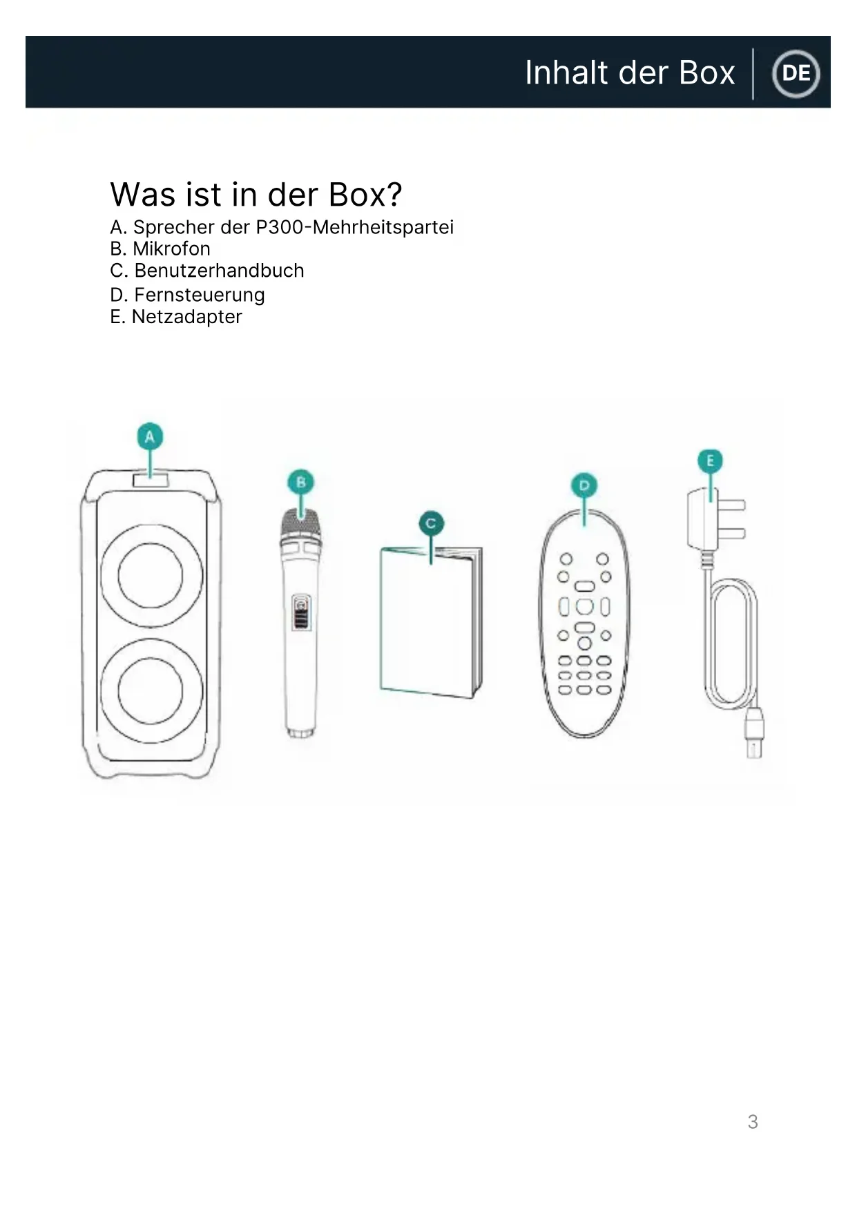 DEInhalt der Box Was ist in der Box? A. Sprecher der P300-Mehrheitspartei B. Mikrofon C. Benutzerhandbuch D. Fernsteuerung E. Netzadapter