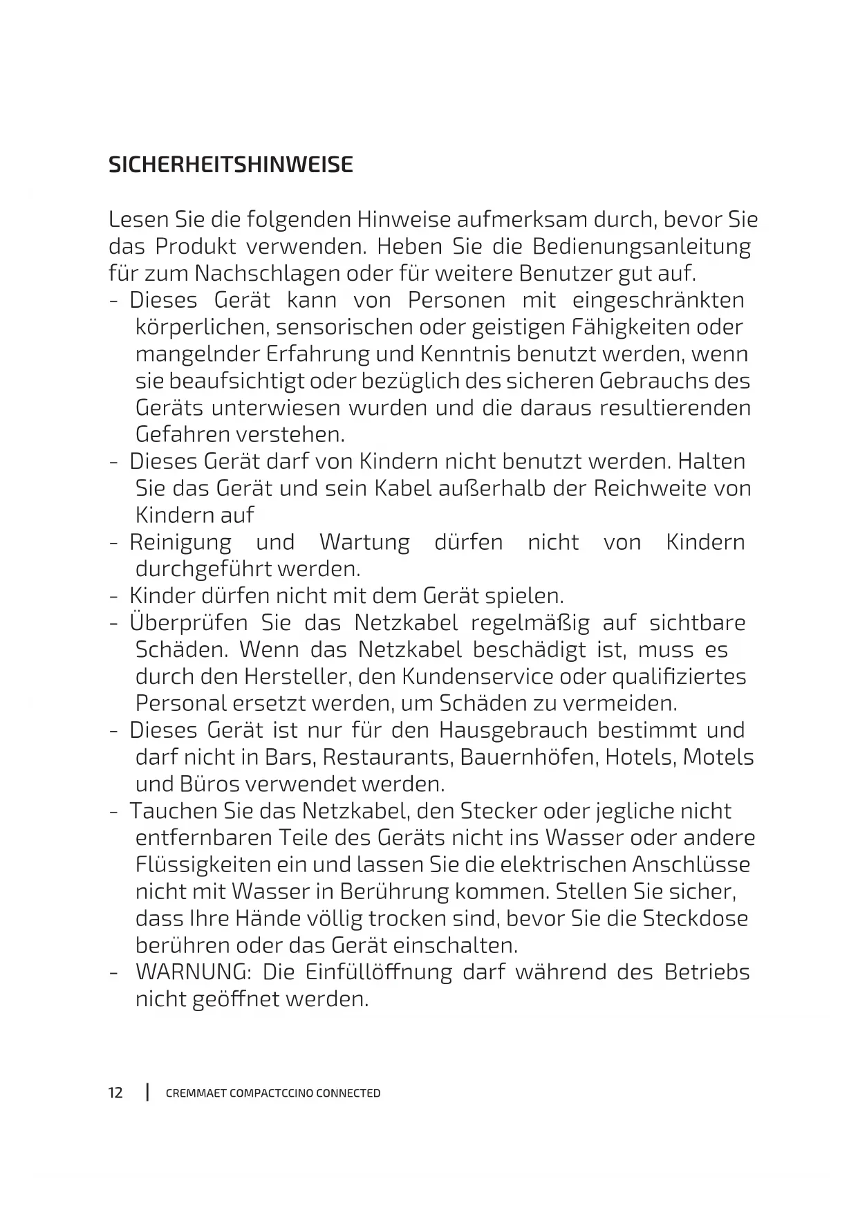 SICHERHEITSHINWEISE Lesen Sie die folgenden Hinweise aufmerksam durch, bevor Sie das Produkt verwenden. Heben Sie die Bedienungsanleitung für zum Nachschlagen oder für weitere Benutzer gut auf. - Dieses Gerät kann von Personen mit eingeschränkten körperlichen, sensorischen oder geistigen Fähigkeiten oder mangelnder Erfahrung und Kenntnis benutzt werden, wenn sie beaufsichtigt oder bezüglich des sicheren Gebrauchs des Geräts unterwiesen wurden und die daraus resultierenden Gefahren verstehen. - Dieses Gerät darf von Kindern nicht benutzt werden. Halten Sie das Gerät und sein Kabel außerhalb der Reichweite von Kindern auf - Reinigung und Wartung dürfen nicht von Kindern durchgeführt werden. - Kinder dürfen nicht mit dem Gerät spielen. - Überprüfen Sie das Netzkabel regelmäßig auf sichtbare Schäden. Wenn das Netzkabel beschädigt ist, muss es durch den Hersteller, den Kundenservice oder qualiziertes Personal ersetzt werden, um Schäden zu vermeiden. - Dieses Gerät ist nur für den Hausgebrauch bestimmt und darf nicht in Bars, Restaurants, Bauernhöfen, Hotels, Motels und Büros verwendet werden. - Tauchen Sie das Netzkabel, den Stecker oder jegliche nicht entfernbaren Teile des Geräts nicht ins Wasser oder andere Flüssigkeiten ein und lassen Sie die elektrischen Anschlüsse nicht mit Wasser in Berührung kommen. Stellen Sie sicher, dass Ihre Hände völlig trocken sind, bevor Sie die Steckdose berühren oder das Gerät einschalten. - WARNUNG: Die Einfüllönung darf während des Betriebs nicht geönet werden.13