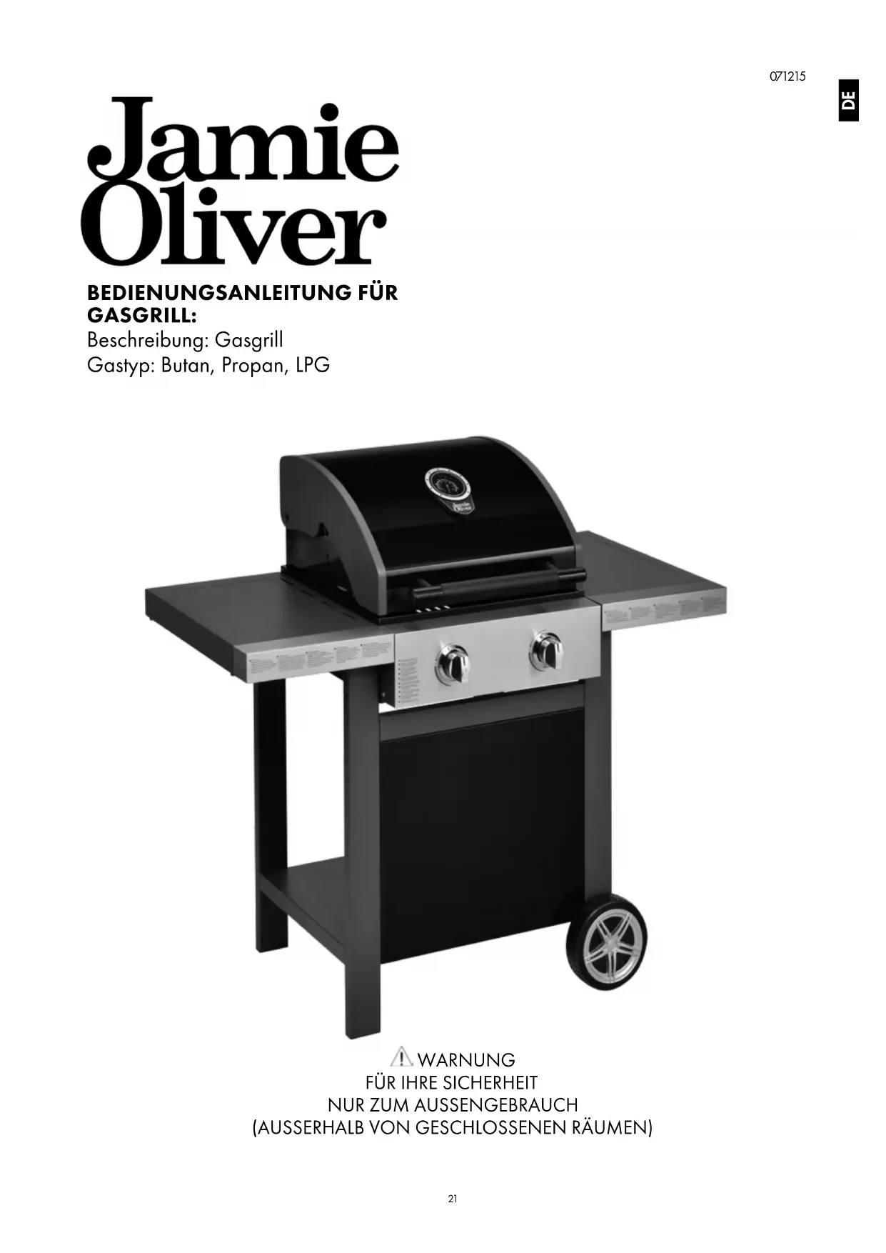 - Sonstige Teile 1 Jahr Diese Garantie gilt nicht: a. für aufgrund von Feuchtigkeit oder Überhitzung verrostete, korrodierte, oxidierte oder entfärbte Teile. b. für Arbeiten oder arbeitsbezogene Kosten. c. bei normaler Abnutzung und Rissen oder Entstopfung. d. bei fahrlässiger Verwendung oder Missbrauch des Produktes. e. bei der Verwendung von falschem Kraftstoff/Gas. f. bei unsachgemäßem Gebrauch, der nicht gemäß der Bedienungsanleitung im Handbuch erfolgt. g. für den Regler, den Schlauch und die Schlauchschellen. h. für die Verschleißteile, z. B. Batterien (ggf.). Durch diese Garantie werden die gesetzlichen Rechte des Kunden nicht beeinträchtigt. Die Garantie ist weltweit anwendbar. Jamie Oliver BBQ behält sich das Recht vor, dieses Produkt ohne Ankündigung zu ändern. Wenn das Modell nicht mehr erhältlich ist, wird ein Ersatz oder Ausgleich vereinbart. Die Garantie gilt 10 Jahre, für einige Teile jedoch nur, wenn sie innerhalb von 30 Tagen ab dem Kaufdatum registriert wurden. Um die Gewährleistungsrechte in Anspruch nehmen zu können, registrieren Sie sich unter www.jamieoliverbbq. com oder füllen Sie die Pflichtfelder auf der Webseite JETZT REGISTRIEREN auf einem gesonderten Blatt aus und senden Sie dieses an Jamie Oliver BBQ Registration. Um einen Anspruch auf Garantieleistungen geltend zu machen, laden Sie bitte das Antragsformular von der Webseite www. jamieoliverbbq.com herunter oder senden Sie ein Schreiben an die Adresse Jamie Oliver BBQ Helpline, Einsteinweg 5, 3752 LW Bunschoten, PO Box 214, 3750 GE Bunschoten, Niederlande, um ein Formular zu erhalten. Bei der Geltendmachung von Ansprüchen muss Folgendes übermittelt werden: a. eine lesbare Kopie der Kaufquittung (inkl. Kaufdatum, Modellname und Geschäft). b. der Modellname und die Modellnummer des Grills. c. das Kaufdatum. d. der Geschäftsname und -standort / oder Sonstiges, z. B. online. e. Fotos der beschädigten Teile, die im Anspruch angegeben werden. Dieses Dokument an einem sicheren Ort aufbewahren.30