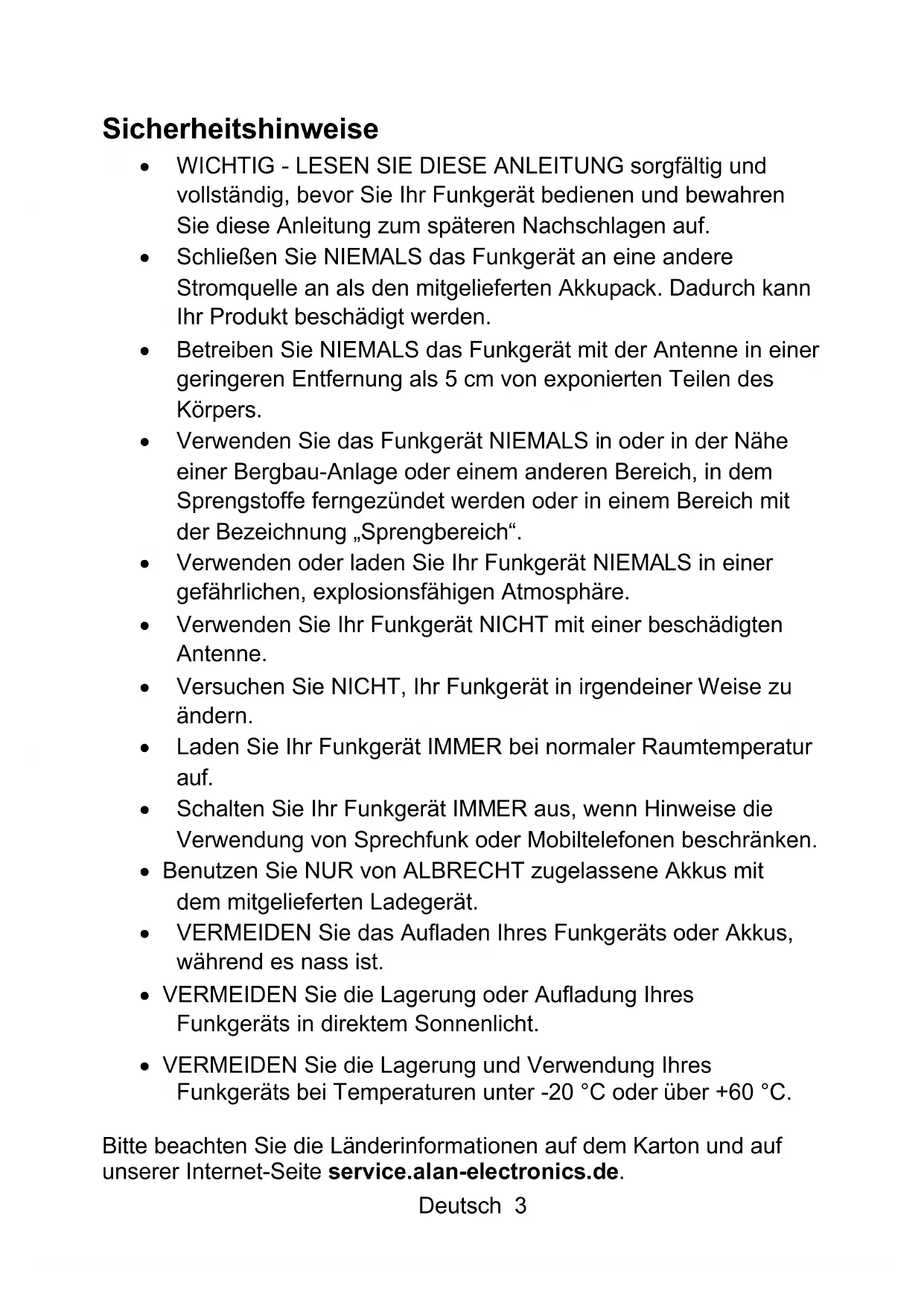 - VERMEIDEN Sie die Lagerung und Verwendung Ihres Funkgeräts bei Temperaturen unter -20 °C oder über +60 °C. Bitte beachten Sie die Länderinformationen auf dem Karton und auf unserer Internet-Seite service.alan-electronics.de.4 Deutsch Lieferumfang