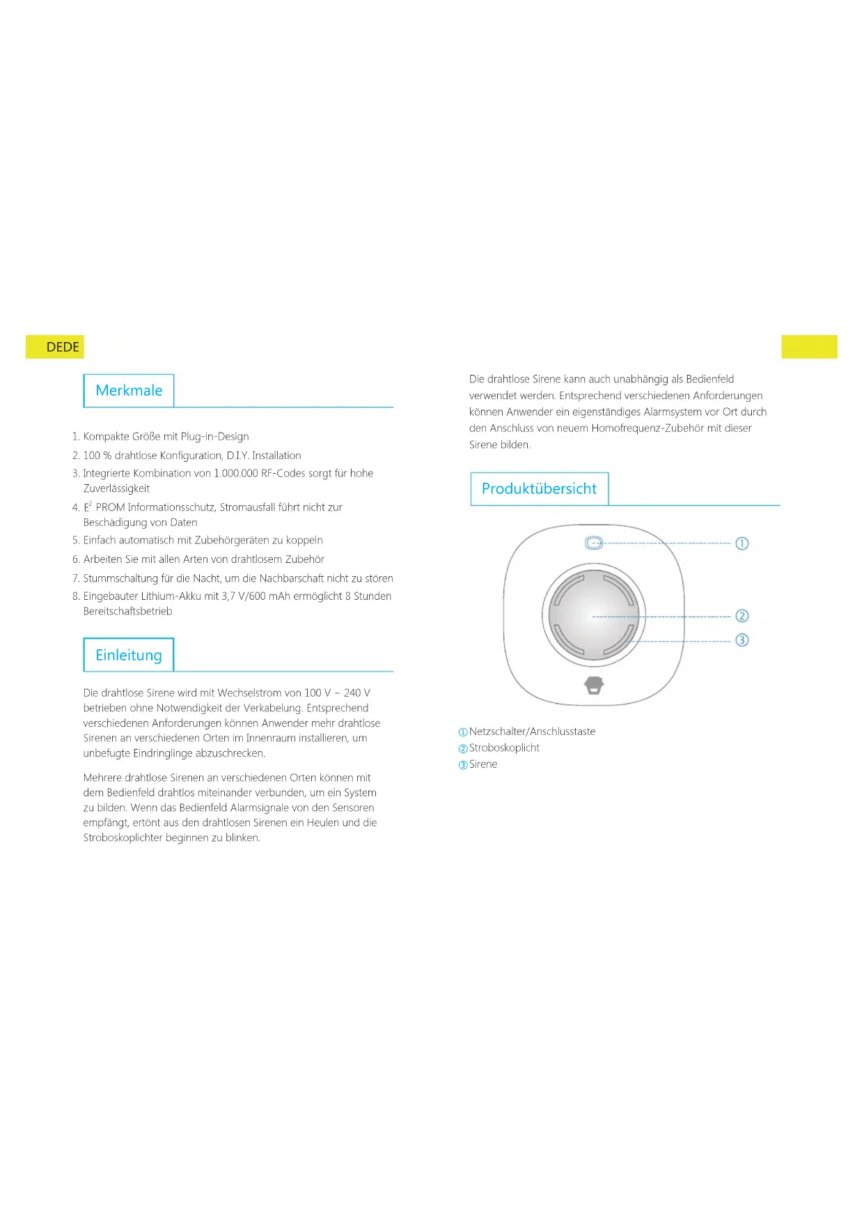 Wenn die Sirene scharfgeschaltet ist, wird beim Auslösen eines Sensors die Sirene heulen und das Stroboskoplicht blinken, um unbefugte Eindringlinge abzuschrecken.