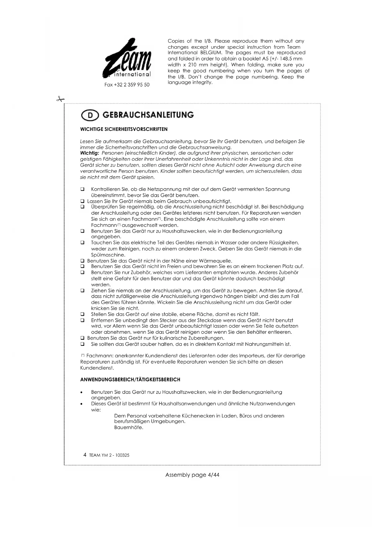 Zum Schutz unserer Umwelt und unserer Gesundheit sind Elektro- und Elektronik-Altgeräte nach bestimmten Regeln zu entsorgen. Dies fordert den Einsatz sowohl des Herstellers bzw. Lieferanten als auch des Verbrauchers. Aus diesem Grund darf dieses Gerät, wie das Symbol auf dem Typenschild bzw. auf der Verpackung zeigt, nicht in den unsortierten Restmüll gegeben werden. Der Verbraucher hat das Recht, dieses Gerät über kommunale Sammelstellen zu entsorgen; von dort aus wird die spezifische Behandlung, Verwertung bzw. das Recycling gem. den Erfordernissen der Richtlinie sichergestellt. Copies of the I/B. Please reproduce them without any changes except under special instruction from Team International BELGIUM. The pages must be reproduced and folded in order to obtain a booklet A5 (+/- 148.5 mm width x 210 mm height). When folding, make sure you keep the good numbering when you turn the pages of the I/B. Don’t change the page numbering. Keep the language integrity.