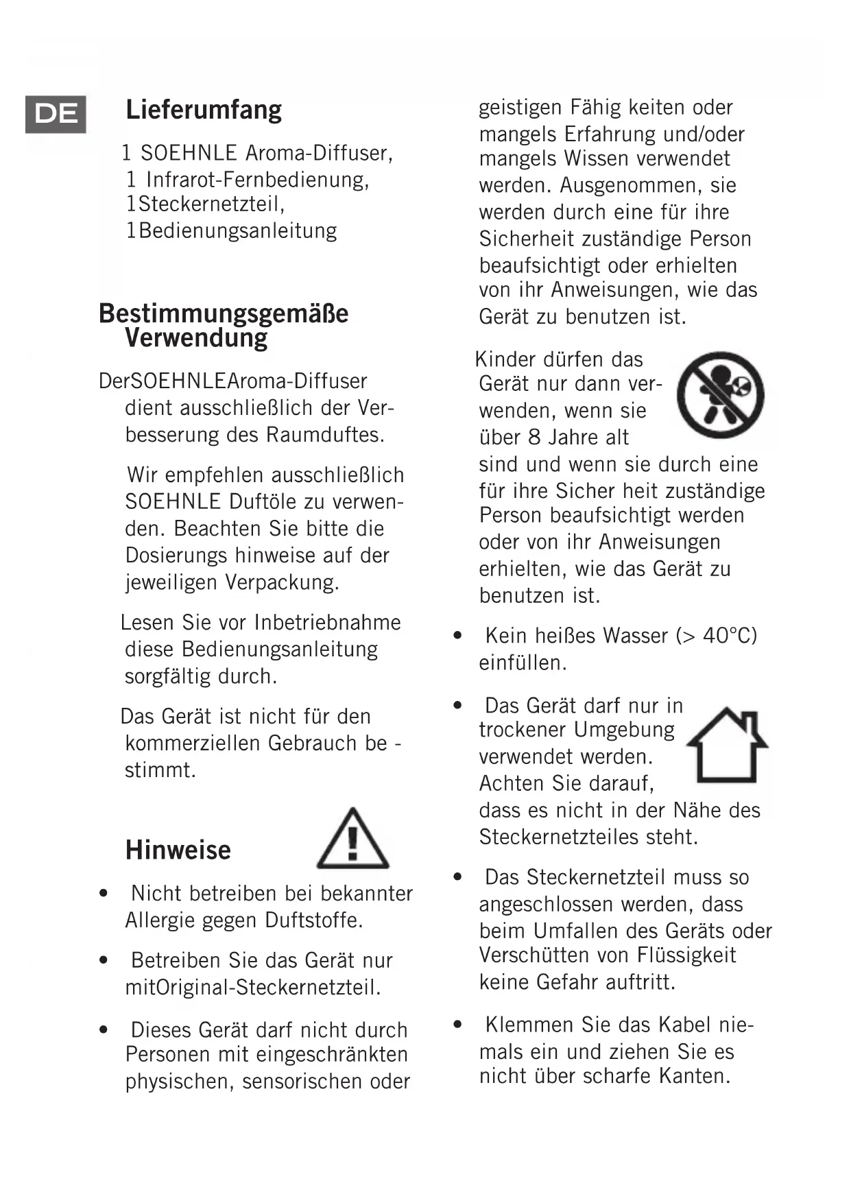 - Не используйте прибор при аллергии на ароматические вещества.max. 100 ml Press 1-2 dropsDE Lieferumfang 1 SOEHNLE Aroma-Diffuser, 1 Infrarot-Fernbedienung, 1 Stecker netzteil, 1 Be die nungs anleitung Bestimmungsgemäße Verwendung Der SOEHNLE Aroma-Diffuser dient ausschließlich der Ver- besserung des Raumduftes. Wir empfehlen ausschließlich SOEHNLE Duftöle zu verwen- den. Beachten Sie bitte die Dosierungs hinweise auf der jeweiligen Verpackung. Lesen Sie vor Inbetriebnahme diese Bedienungsanleitung sorgfältig durch. Das Gerät ist nicht für den kommerziellen Gebrauch be - stimmt. Hinweise