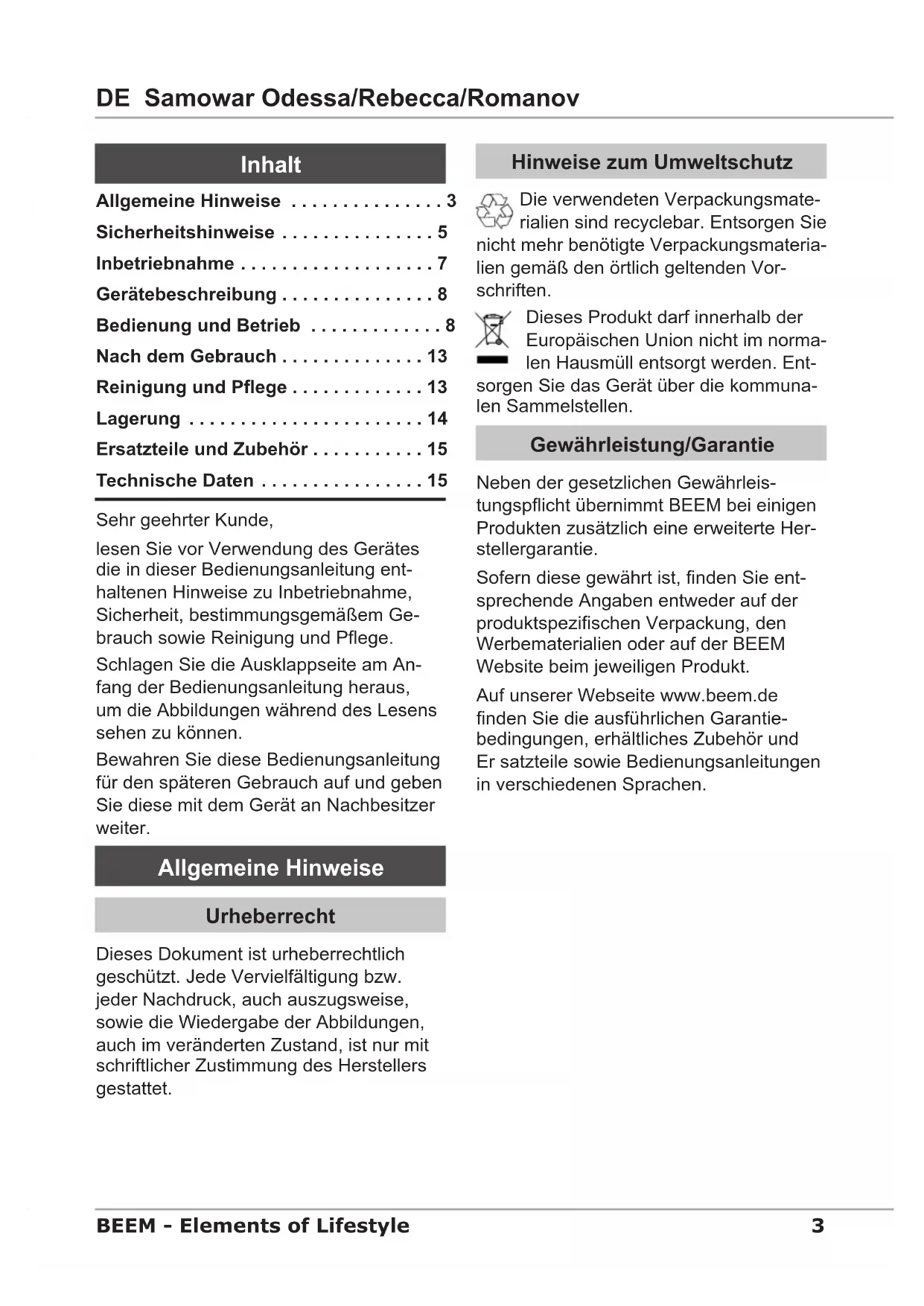 - Odessa/Rebecca3 DE Samowar Odessa/Rebecca/Romanov BEEM - Elements of Lifestyle Sehr geehrter Kunde, lesen Sie vor Verwendung des Gerätes die in dieser Bedienungsanleitung ent- haltenen Hinweise zu Inbetriebnahme, Sicherheit, bestimmungsgemäßem Ge- brauch sowie Reinigung und Pege. Schlagen Sie die Ausklappseite am An- fang der Bedienungsanleitung heraus, um die Abbildungen während des Lesens sehen zu können. Bewahren Sie diese Bedienungsanleitung für den späteren Gebrauch auf und geben Sie diese mit dem Gerät an Nachbesitzer weiter. Allgemeine Hinweise Urheberrecht Dieses Dokument ist urheberrechtlich geschützt. Jede Vervielfältigung bzw. jeder Nachdruck, auch auszugsweise, sowie die Wiedergabe der Abbildungen, auch im veränderten Zustand, ist nur mit schriftlicher Zustimmung des Herstellers gestattet. Hinweise zum Umweltschutz Die verwendeten Verpackungsmate- rialien sind recyclebar. Entsorgen Sie nicht mehr benötigte Verpackungsmateria- lien gemäß den örtlich geltenden Vor- schriften. Dieses Produkt darf innerhalb der Europäischen Union nicht im norma- len Hausmüll entsorgt werden. Ent- sorgen Sie das Gerät über die kommuna- len Sammelstellen. Gewährleistung/Garantie Neben der gesetzlichen Gewährleis- tungspicht übernimmt BEEM bei einigen Produkten zusätzlich eine erweiterte Her- stellergarantie. Sofern diese gewährt ist, nden Sie ent- sprechende Angaben entweder auf der produktspezischen Verpackung, den Werbematerialien oder auf der BEEM Website beim jeweiligen Produkt. Auf unserer Webseite www.beem.de nden Sie die ausführlichen Garantie- bedingungen, erhältliches Zubehör und Er satzteile sowie Bedienungsanleitungen in verschiedenen Sprachen. Allgemeine Hinweise p. 3