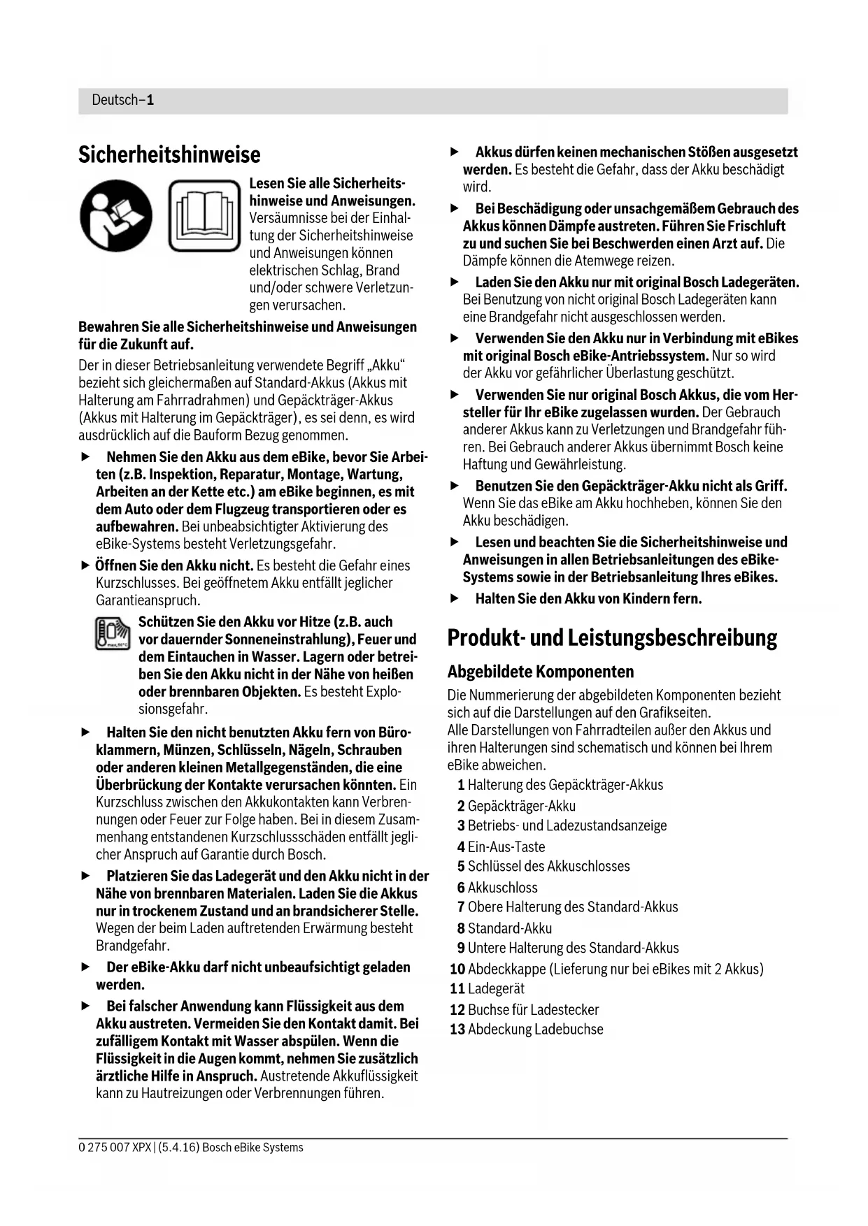 ADeutsch–1 0 275 007 XPX | (5.4.16) Bosch eBike Systems Sicherheitshinweise Lesen Sie alle Sicherheits- hinweise und Anweisungen. Versäumnisse bei der Einhal- tung der Sicherheitshinweise und Anweisungen können elektrischen Schlag, Brand und/oder schwere Verletzun- gen verursachen. Bewahren Sie alle Sicherheitshinweise und Anweisungen für die Zukunft auf. Der in dieser Betriebsanleitung verwendete Begriff „Akku“ bezieht sich gleichermaßen auf Standard-Akkus (Akkus mit Halterung am Fahrradrahmen) und Gepäckträger-Akkus (Akkus mit Halterung im Gepäckträger), es sei denn, es wird ausdrücklich auf die Bauform Bezug genommen. Nehmen Sie den Akku aus dem eBike, bevor Sie Arbei- ten (z.B. Inspektion, Reparatur, Montage, Wartung, Arbeiten an der Kette etc.) am eBike beginnen, es mit dem Auto oder dem Flugzeug transportieren oder es aufbewahren. Bei unbeabsichtigter Aktivierung des eBike-Systems besteht Verletzungsgefahr. Öffnen Sie den Akku nicht. Es besteht die Gefahr eines Kurzschlusses. Bei geöffnetem Akku entfällt jeglicher Garantieanspruch. Schützen Sie den Akku vor Hitze (z.B. auch vor dauernder Sonneneinstrahlung), Feuer und dem Eintauchen in Wasser. Lagern oder betrei- ben Sie den Akku nicht in der Nähe von heißen oder brennbaren Objekten. Es besteht Explo- sionsgefahr. Halten Sie den nicht benutzten Akku fern von Büro- klammern, Münzen, Schlüsseln, Nägeln, Schrauben oder anderen kleinen Metallgegenständen, die eine Überbrückung der Kontakte verursachen könnten. Ein Kurzschluss zwischen den Akkukontakten kann Verbren- nungen oder Feuer zur Folge haben. Bei in diesem Zusam- menhang entstandenen Kurzschlussschäden entfällt jegli- cher Anspruch auf Garantie durch Bosch. Platzieren Sie das Ladegerät und den Akku nicht in der Nähe von brennbaren Materialen. Laden Sie die Akkus nur in trockenem Zustand und an brandsicherer Stelle. Wegen der beim Laden auftretenden Erwärmung besteht Brandgefahr. Der eBike-Akku darf nicht unbeaufsichtigt geladen werden. Bei falscher Anwendung kann Flüssigkeit aus dem Akku austreten. Vermeiden Sie den Kontakt damit. Bei zufälligem Kontakt mit Wasser abspülen. Wenn die Flüssigkeit in die Augen kommt, nehmen Sie zusätzlich ärztliche Hilfe in Anspruch. Austretende Akkuflüssigkeit kann zu Hautreizungen oder Verbrennungen führen. Akkus dürfen keinen mechanischen Stößen ausgesetzt werden. Es besteht die Gefahr, dass der Akku beschädigt wird. Bei Beschädigung oder unsachgemäßem Gebrauch des Akkus können Dämpfe austreten. Führen Sie Frischluft zu und suchen Sie bei Beschwerden einen Arzt auf. Die Dämpfe können die Atemwege reizen. Laden Sie den Akku nur mit original Bosch Ladegeräten. Bei Benutzung von nicht original Bosch Ladegeräten kann eine Brandgefahr nicht ausgeschlossen werden. Verwenden Sie den Akku nur in Verbindung mit eBikes mit original Bosch eBike-Antriebssystem. Nur so wird der Akku vor gefährlicher Überlastung geschützt. Verwenden Sie nur original Bosch Akkus, die vom Her- steller für Ihr eBike zugelassen wurden. Der Gebrauch anderer Akkus kann zu Verletzungen und Brandgefahr füh- ren. Bei Gebrauch anderer Akkus übernimmt Bosch keine Haftung und Gewährleistung. Benutzen Sie den Gepäckträger-Akku nicht als Griff. Wenn Sie das eBike am Akku hochheben, können Sie den Akku beschädigen. Lesen und beachten Sie die Sicherheitshinweise und Anweisungen in allen Betriebsanleitungen des eBike- Systems sowie in der Betriebsanleitung Ihres eBikes. Halten Sie den Akku von Kindern fern. Produkt- und Leistungsbeschreibung Abgebildete Komponenten Die Nummerierung der abgebildeten Komponenten bezieht sich auf die Darstellungen auf den Grafikseiten. Alle Darstellungen von Fahrradteilen außer den Akkus und ihren Halterungen sind schematisch und können bei Ihrem eBike abweichen. 1 Halterung des Gepäckträger-Akkus 2 Gepäckträger-Akku 3 Betriebs- und Ladezustandsanzeige 4 Ein-Aus-Taste 5 Schlüssel des Akkuschlosses 6 Akkuschloss 7 Obere Halterung des Standard-Akkus 8 Standard-Akku 9 Untere Halterung des Standard-Akkus 10 Abdeckkappe (Lieferung nur bei eBikes mit 2 Akkus) 11 Ladegerät 12 Buchse für Ladestecker 13 Abdeckung LadebuchseDeutsch–2 Bosch eBike Systems 0 275 007 XPX | (5.4.16) Technische Daten Montage Stellen Sie den Akku nur auf sauberen Flächen auf. Vermeiden Sie insbesondere die Verschmutzung der Lade- buchse und der Kontakte, z.B. durch Sand oder Erde. Akku vor der ersten Benutzung prüfen Prüfen Sie den Akku, bevor Sie ihn das erste Mal aufladen oder mit Ihrem eBike benutzen. Drücken Sie dazu die Ein-Aus-Taste 4 zum Einschalten des Akkus. Leuchtet keine LED der Ladezustandsanzeige 3 auf, dann ist der Akku möglicherweise beschädigt. Leuchtet mindestens eine, aber nicht alle LEDs der Lade- zustandsanzeige 3, dann laden Sie den Akku vor der ersten Benutzung voll auf. Laden Sie einen beschädigten Akku nicht auf und benutzen Sie ihn nicht. Wenden Sie sich an einen autori- sierten Fahrradhändler. Akku laden Benutzen Sie nur das im Lieferumfang Ihres eBikes ent- haltene oder ein baugleiches original Bosch Ladegerät. Nur dieses Ladegerät ist auf den bei Ihrem eBike verwen- deten Li-Ionen-Akku abgestimmt. Hinweis: Der Akku wird teilgeladen ausgeliefert. Um die volle Leistung des Akkus zu gewährleisten, laden Sie ihn vor dem ersten Einsatz vollständig mit dem Ladegerät auf. Lesen und beachten Sie zum Laden des Akkus die Betriebs- anleitung des Ladegerätes. Der Akku kann jederzeit einzeln oder am Fahrrad aufgeladen werden, ohne die Lebensdauer zu verkürzen. Eine Unterbre- chung des Ladevorganges schädigt den Akku nicht. Der Akku ist mit einer Temperaturüberwachung ausgestattet, welche ein Aufladen nur im Temperaturbereich zwischen 0 °C und 40 °C zulässt. Befindet sich der Akku außer- halb des Ladetemperaturberei- ches, blinken drei LEDs der Ladezustandsanzeige 3. Tren- nen Sie den Akku vom Ladegerät und lassen Sie ihn austem- perieren. Schließen Sie den Akku erst wieder an das 