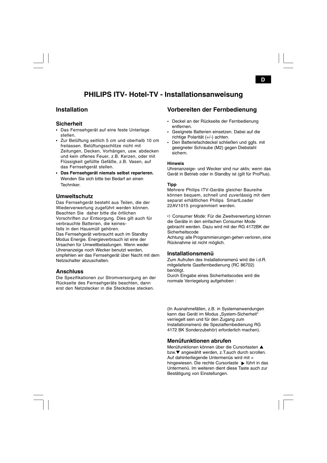PHILIPS ITV- Hotel-TV - Installationsanweisung Installation Sicherheit