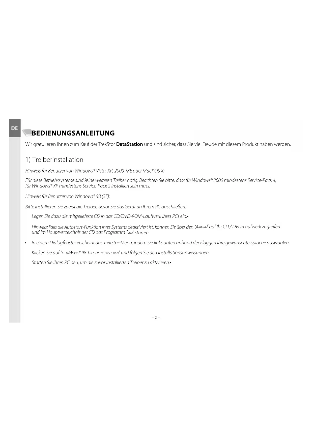 Hinweis für Benutzer von Windows® Vista, XP, 2000, ME oder Mac® OS X: Für diese Betriebssysteme sind keine weiteren Treiber nötig. Beachten Sie bitte, dass für Windows® 2000 mindestens Service-Pack 4, für Windows® XP mindestens Service-Pack 2 installiert sein muss. Hinweis für Benutzer von Windows® 98 (SE): Bitte installieren Sie zuerst die Treiber, bevor Sie das Gerät an Ihrem PC anschließen! Legen Sie dazu die mitgelieferte CD in das CD/DVD-ROM-Laufwerk Ihres PCs ein.• Hinweis: Falls die Autostart-Funktion Ihres Systems deaktiviert ist, können Sie über den "A r b e i t s p l A t z " auf Ihr CD / DVD-Laufwerk zugreifen und im Hauptverzeichnis der CD das Programm " m e n u .e x e " starten. In einem Dialogfenster erscheint das TrekStor-Menü, indem Sie links unten anhand der Flaggen Ihre gewünschte Sprache auswählen.• Klicken Sie auf "• W i n d o W s ® 98 tr e i b e r i n s t A l l i e r e n " und folgen Sie den Installationsanweisungen. Starten Sie Ihren PC neu, um die zuvor installierten Treiber zu aktivieren.•– 2 – – 3 –