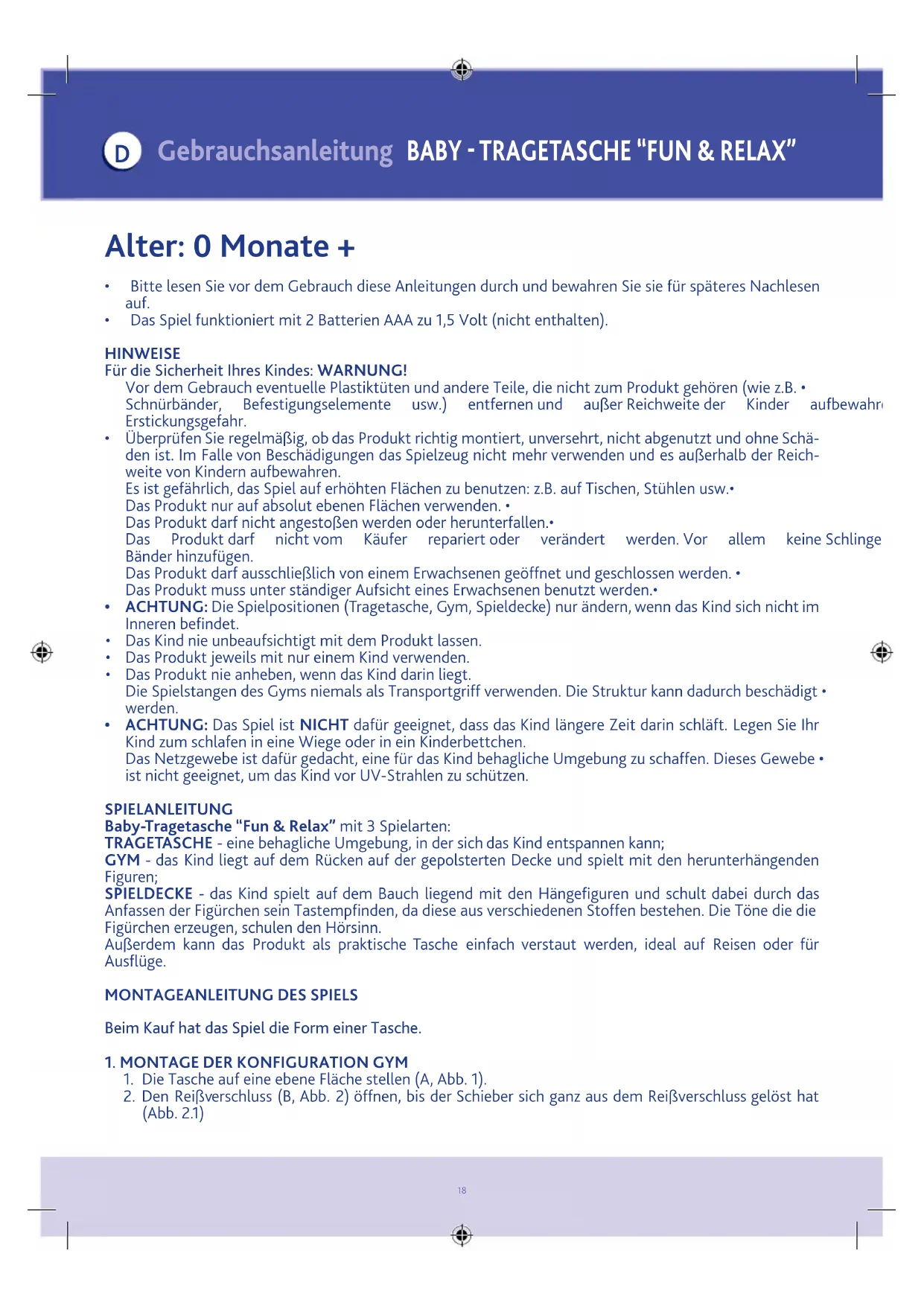 - DasSpielfunktioniertmit2BatterienAAAzu1,5Volt(nichtenthalten). HINWEISE Für die Sicherheit Ihres Kindes: WARNUNG! VordemGebraucheventuellePlastiktütenundandereTeile,dienichtzumProduktgehören(wiez.B.• Schnürbänder, Befestigungselemente usw.) entfernenund außerReichweiteder Kinder aufbewahren. Erstickungsgefahr. ÜberprüfenSieregelmäßig,obdasProduktrichtigmontiert,unversehrt,nichtabgenutztundohneSchä-• denist.ImFallevonBeschädigungendasSpielzeugnichtmehrverwendenundesaußerhalbderReich- weitevonKindernaufbewahren. Esistgefährlich,dasSpielauferhöhtenFlächenzubenutzen:z.B.aufTischen,Stühlenusw.• DasProduktnuraufabsolutebenenFlächenverwenden.• DasProduktdarfnichtangestoßenwerdenoderherunterfallen.• Das Produktdarf nichtvom Käufer repariertoder verändert werden.Vor allem keineSchlingen oder• Bänderhinzufügen. DasProduktdarfausschließlichvoneinemErwachsenengeöffnetundgeschlossenwerden.• DasProduktmussunterständigerAufsichteinesErwachsenenbenutztwerden.• ACHTUNG: • DieSpielpositionen(Tragetasche,Gym,Spieldecke)nurändern,wenndasKindsichnichtim Innerenbendet. DasKindnieunbeaufsichtigtmitdemProduktlassen.• DasProduktjeweilsmitnureinemKindverwenden.• DasProduktnieanheben,wenndasKinddarinliegt.• DieSpielstangendesGymsniemalsalsTransportgriffverwenden.DieStrukturkanndadurchbeschädigt• werden. ACHTUNG: • DasSpielist NICHTdafürgeeignet,dassdasKindlängereZeitdarinschläft.LegenSieIhr KindzumschlafenineineWiegeoderineinKinderbettchen. DasNetzgewebeistdafürgedacht,einefürdasKindbehaglicheUmgebungzuschaffen.DiesesGewebe• istnichtgeeignet,umdasKindvorUV-Strahlenzuschützen. SPIELANLEITUNG Baby-Tragetasche “Fun & Relax”mit3Spielarten: TRAGETASCHE-einebehaglicheUmgebung,indersichdasKindentspannenkann; GYM -dasKindliegtaufdemRückenaufdergepolstertenDeckeundspieltmitdenherunterhängenden Figuren; SPIELDECKE-dasKindspieltaufdemBauchliegendmitdenHängegurenundschultdabeidurchdas AnfassenderFigürchenseinTastempnden,dadieseausverschiedenenStoffenbestehen.DieTönediedie Figürchenerzeugen,schulendenHörsinn. Außerdem kann das Produkt als praktische Tasche einfach verstaut werden, ideal auf Reisen oder für Ausüge.