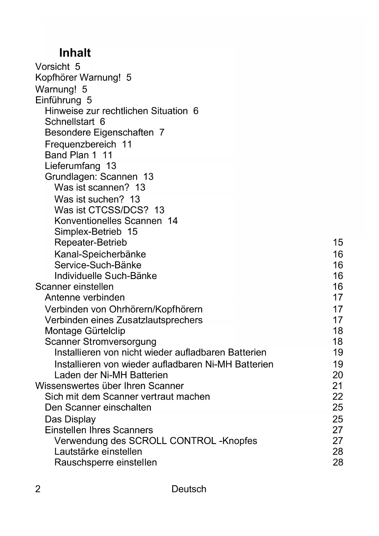 Inhalt Vorsicht 5 Kopfhörer Warnung! 5 Warnung! 5 Einführung 5 Hinweise zur rechtlichen Situation 6 Schnellstart 6 Besondere Eigenschaften 7 Frequenzbereich 11 Band Plan 1 11 Lieferumfang 13 Grundlagen: Scannen 13 Was ist scannen? 13 Was ist suchen? 13 Was ist CTCSS/DCS? 13 Konventionelles Scannen 14 Simplex-Betrieb 15 Repeater-Betrieb 15 Kanal-Speicherbänke 16 Service-Such-Bänke 16 Individuelle Such-Bänke 16 Scanner einstellen 16 Antenne verbinden 17 Verbinden von Ohrhörern/Kopfhörern 17 Verbinden eines Zusatzlautsprechers 17 Montage Gürtelclip 18 Scanner Stromversorgung 18 Installieren von nicht wieder aufladbaren Batterien 19 Installieren von wieder aufladbaren Ni-MH Batterien 19 Laden der Ni-MH Batterien 20 Wissenswertes über Ihren Scanner 21 Sich mit dem Scanner vertraut machen 22 Den Scanner einschalten 25 Das Display 25 Einstellen Ihres Scanners 27 Verwendung des SCROLL CONTROL -Knopfes 27 Lautstärke einstellen 28 Rauschsperre einstellen 28Deutsch