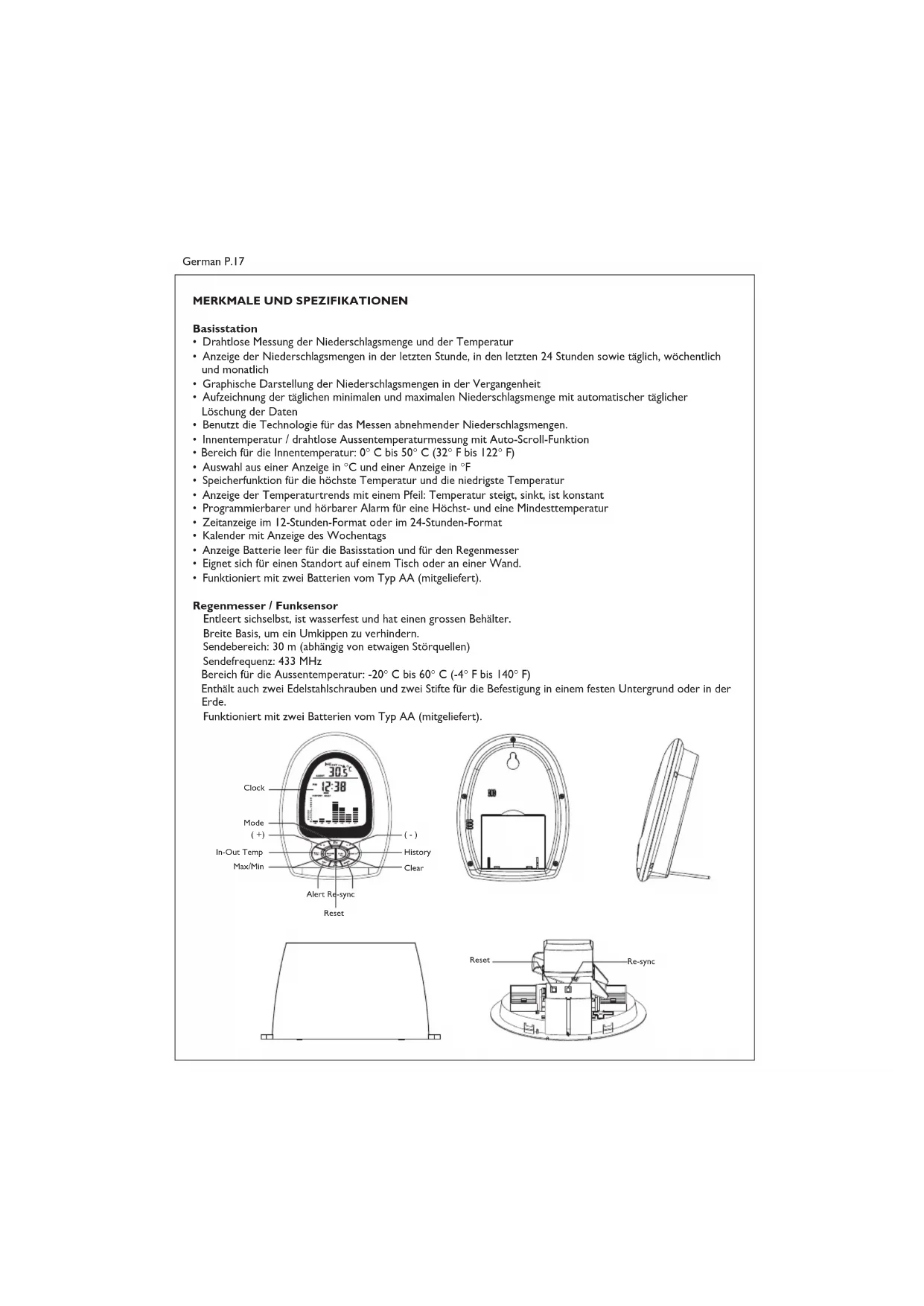 Wenn jederzeit die Aussentemperatur und die Niederschlagsratio angezeigt wurden und wenn jetzt "—C" oder "—mm" angezeigt wird, kann es sein, dass die Synchronisierung feht. In thisem Fall mussen Sie an der Basisstation die RE-SYNC-Taste und im Regenmesser die RE-SYNC-Taste drücken. Die Basisstation sicht dann sechs Minuten lang die Verbindung das Funksignal des Regenmessers und die Verbindung wird wiederhergestellt.