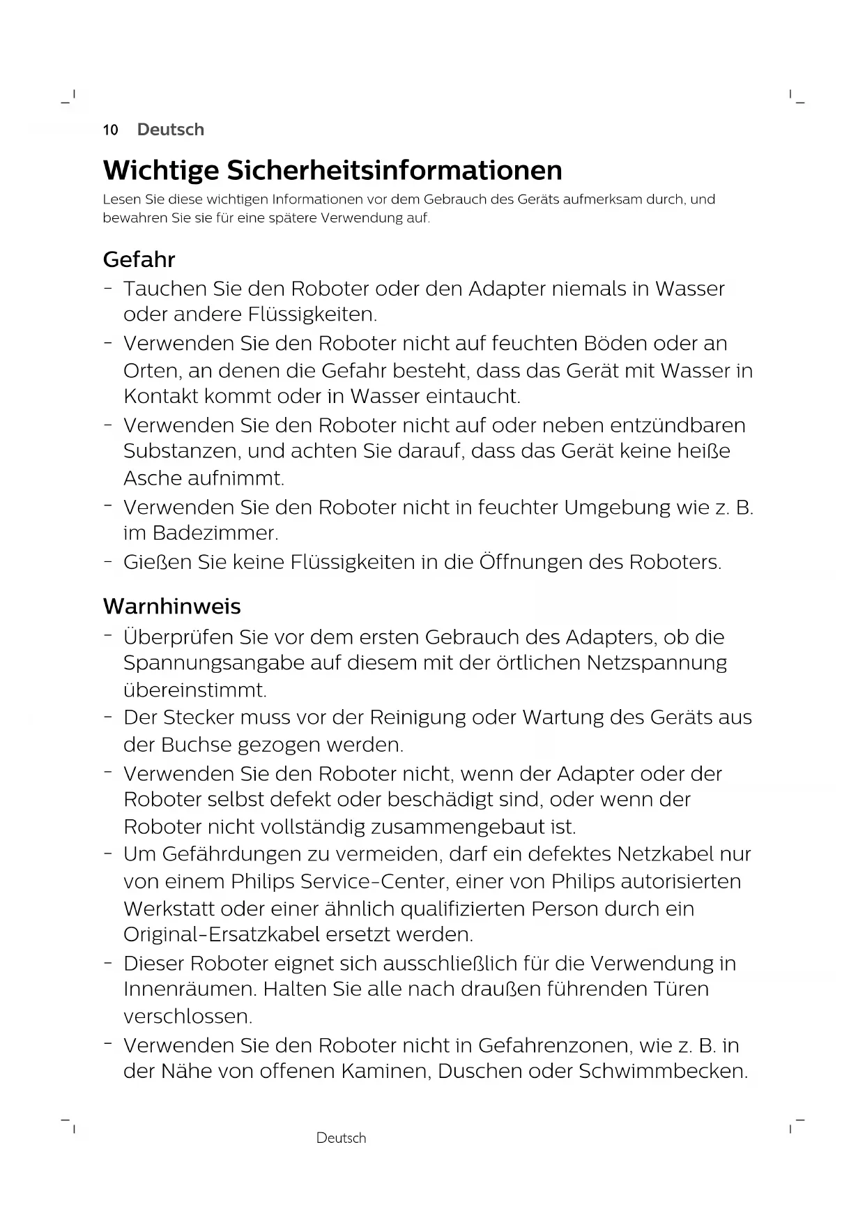 Verwenden Sie den Roboter nicht auf feuchten Böden oder an Orten, an denen die Gefahr besteht, dass das Gerät mit Wasser in Kontakt kommt oder in Wasser eintaucht.