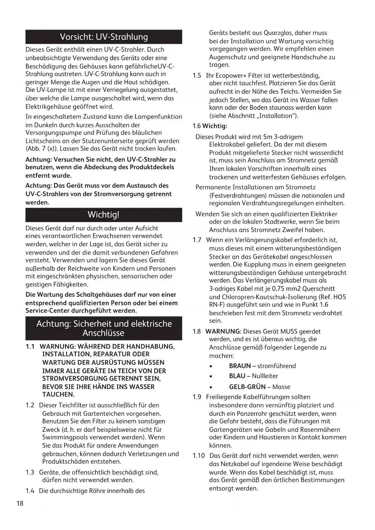 1.1 WARNUNG: WÄHREND DER HANDHABUNG, INSTALLATION, REPARATUR ODER WARTUNG DER AUSRÜSTUNG MÜSSEN IMMER ALLE GERÄTE IM TEICH VON DER STROMVERSORGUNG GETRENNT SEIN, BEVOR SIE IHRE HÄNDE INS WASSER TAUCHEN.