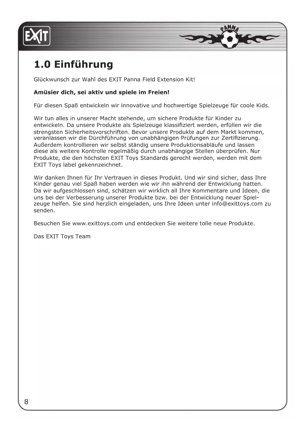 Wir danken Ihnen für Ihr Vertrauen in diesen Produkt. Und wir sind sichere, dass ihre Kinder genau viel Spaß haben werden wie wir他们在 während der Entwicklung hatten. Da wir aufgeschlossen sind, schätzen wir wirklich all ihre Kommentare und Ideen, die uns bei der Verbesserung unserer Produkte bzw. bei der Entwicklung neuer Spiel-zeuge halten. Sie sind herzlich eingeladen, uns ihre Ideen unter info@exittoys.com zu senden.