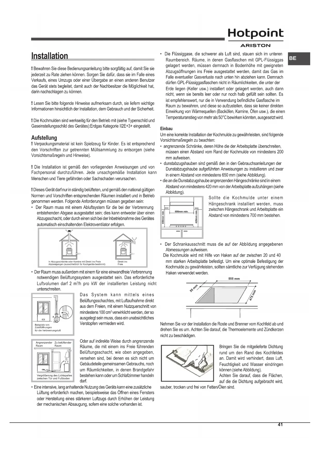 - Die Flüssiggase, die schwerer als Luft sind, stauen sich im unteren Raumbereich. Räume, in denen Gasflaschen mit GPL-Flüssiggas gelagert werden, müssen demnach in Bodenhöhe mit geeigneten Abzugsöffnungen ins Freie ausgestattet werden, damit das Gas im Falle eventueller Gasverluste nach unten hin abziehen kann. Demnach dürfen GPL-Flüssiggasaschen nicht in Räumlichkeiten, die unter der Erde liegen (Keller usw.) installiert oder gelagert werden, auch dann nicht, wenn sie bereits leer oder nur noch halb gefüllt sein sollten. Es ist empfehlenswert, nur die in Verwendung bendliche Gasasche im Raum zu bewahren, und diese so aufzustellen, dass sie keiner direkten Einwirkung von Wärmequellen (Backöfen, Kamine, Öfen usw.), die einen Temperaturanstieg von mehr als 50°C bewirken könnten, ausgesetzt wird. Einbau Um eine korrekte Installation der Kochmulde zu gewährleisten, sind folgende Vorsichtsmaßregeln zu beachten: