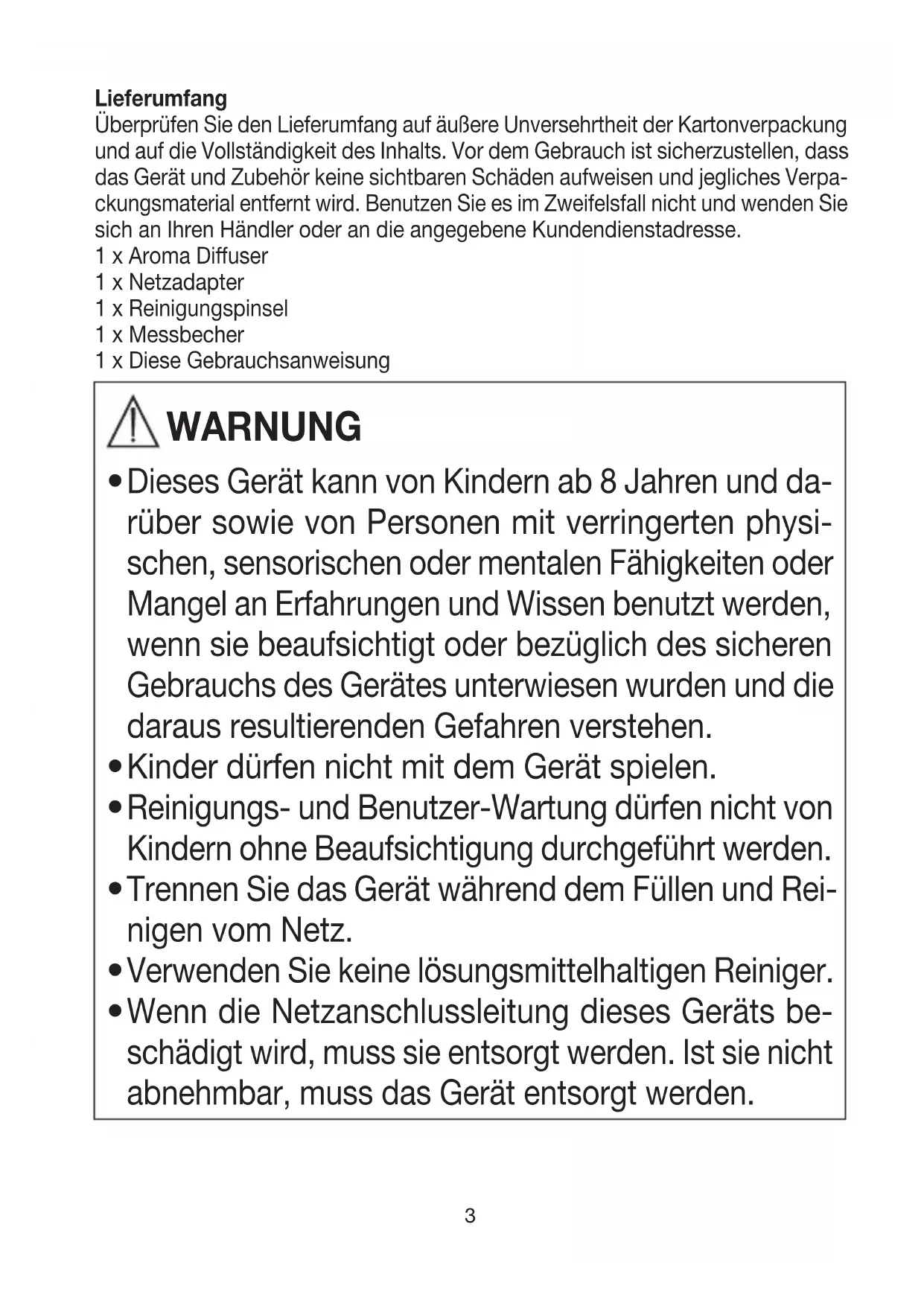 Wenn die Netzanschlussleitung dieses Geräts be- schädigt wird, muss sie entsorgt werden. Ist sie nicht abnehmbar, muss das Gerät entsorgt werden.4 1 Zeichenerklärung Folgende Symbole werden in dieser Gebrauchsanweisung und auf dem Gerät verwendet: WARNUNG Warnhinweis auf Verletzungsgefahren oder Gefahren für Ihre Ge- sundheit. ACHTUNG Sicherheitshinweis auf mögliche Schäden am Gerät/Zubehör. Hinweis Hinweis auf wichtige Informationen. Gebrauchsanweisung beachten Entsorgung gemäß Elektro- und Elektronik-Altgeräte EG-Richtlinie – WEEE (Waste Electrical and Electronic Equipment) Dieses Produkt erfüllt die Anforderungen der geltenden europäischen und nationalen Richtlinien. Hersteller 2 Bestimmungsgemäßer Gebrauch Der Aroma Diuser ist ausschließlich zur Verbesserung des Raumduftes bestimmt. Das Gerät ist für den privaten Gebrauch bestimmt. Verwenden Sie das Gerät ausschließlich für den Zweck, für den es entwickelt wurde und auf die in dieser Gebrauchsanweisung angegebene Art und Weise. Je- der unsachgemäße Gebrauch kann gefährlich sein! Der Hersteller haftet nicht für Schäden, die durch unsachgemäßen oder falschen Gebrauch verursacht wurden.5 3 Hinweise Ein Nichtbeachten der nachfolgenden Hinweise kann Personen- oder Sachschä- den verursachen. Sicherheitshinweise WARNUNG