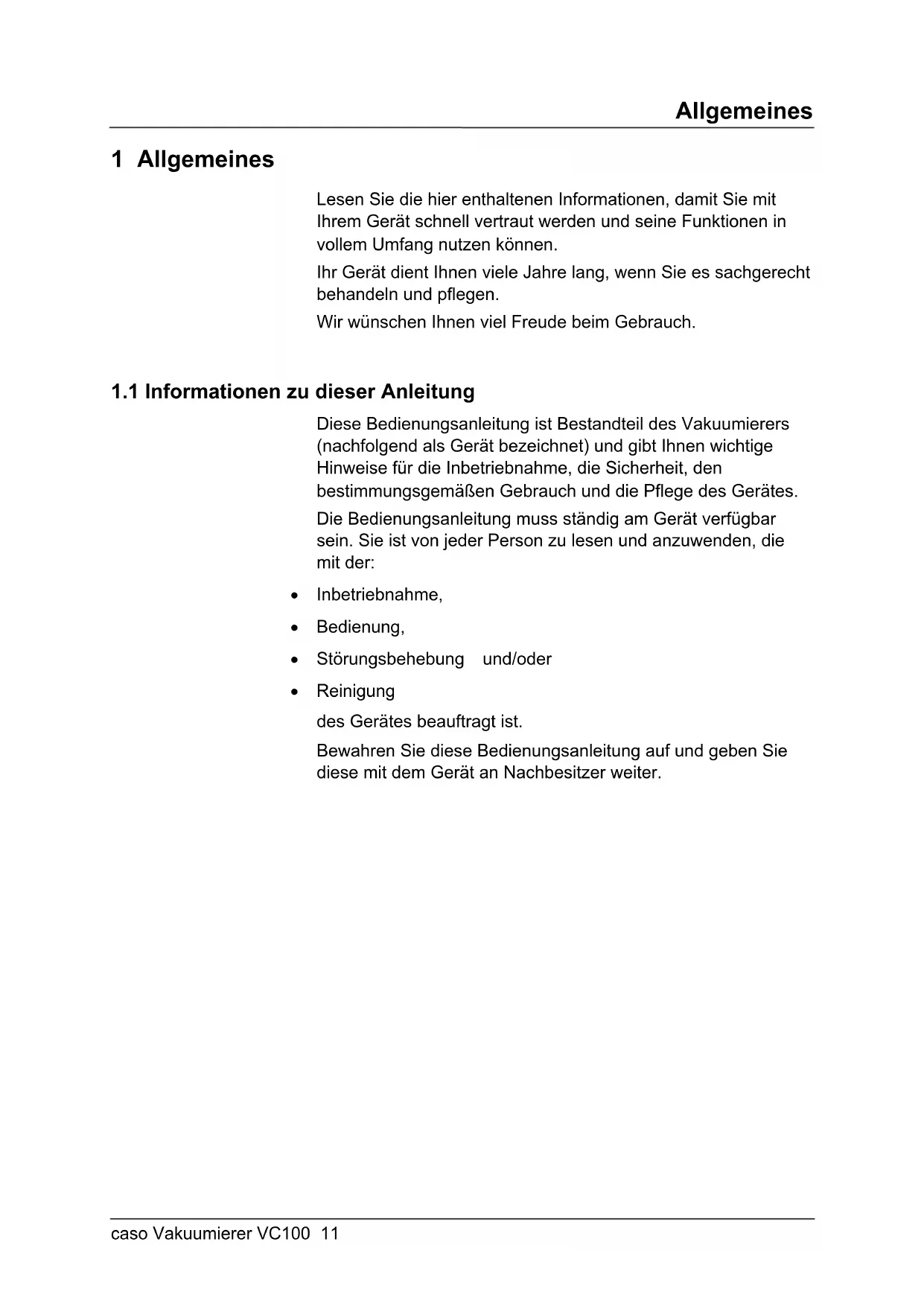 - Reinigung des Gerätes beauftragt ist. Bewahren Sie diese Bedienungsanleitung auf und geben Sie diese mit dem Gerät an Nachbesitzer weiter.Allgemeines caso Vakuumierer VC100 12