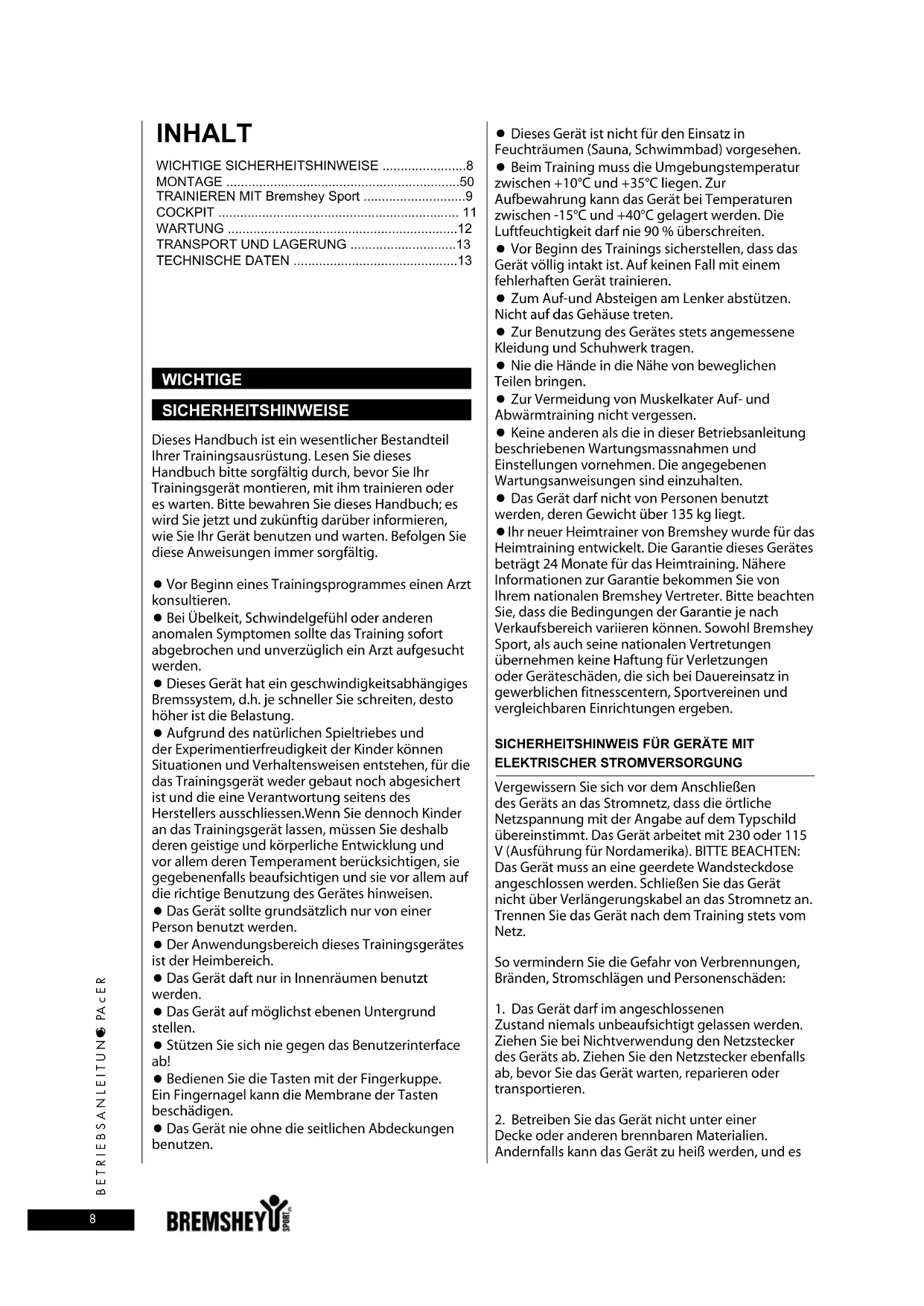 - Ihr neuer Heimtrainer von Bremshey wurde für das Heimtraining entwickelt. Die Garantie dieses Gerätes beträgt 24 Monate für das Heimtraining. Nähere Informationen zur Garantie bekommen Sie von Ihrem nationalen Bremshey Vertreter. Bitte beachten Sie, dass die Bedingungen der Garantie je nach Verkaufsbereich variieren können. Sowohl Bremshey Sport, als auch seine nationalen Vertretungen übernehmen keine Haftung für Verletzungen oder Geräteschäden, die sich bei Dauereinsatz in gewerblichen fitnesscentern, Sportvereinen und vergleichbaren Einrichtungen ergeben.