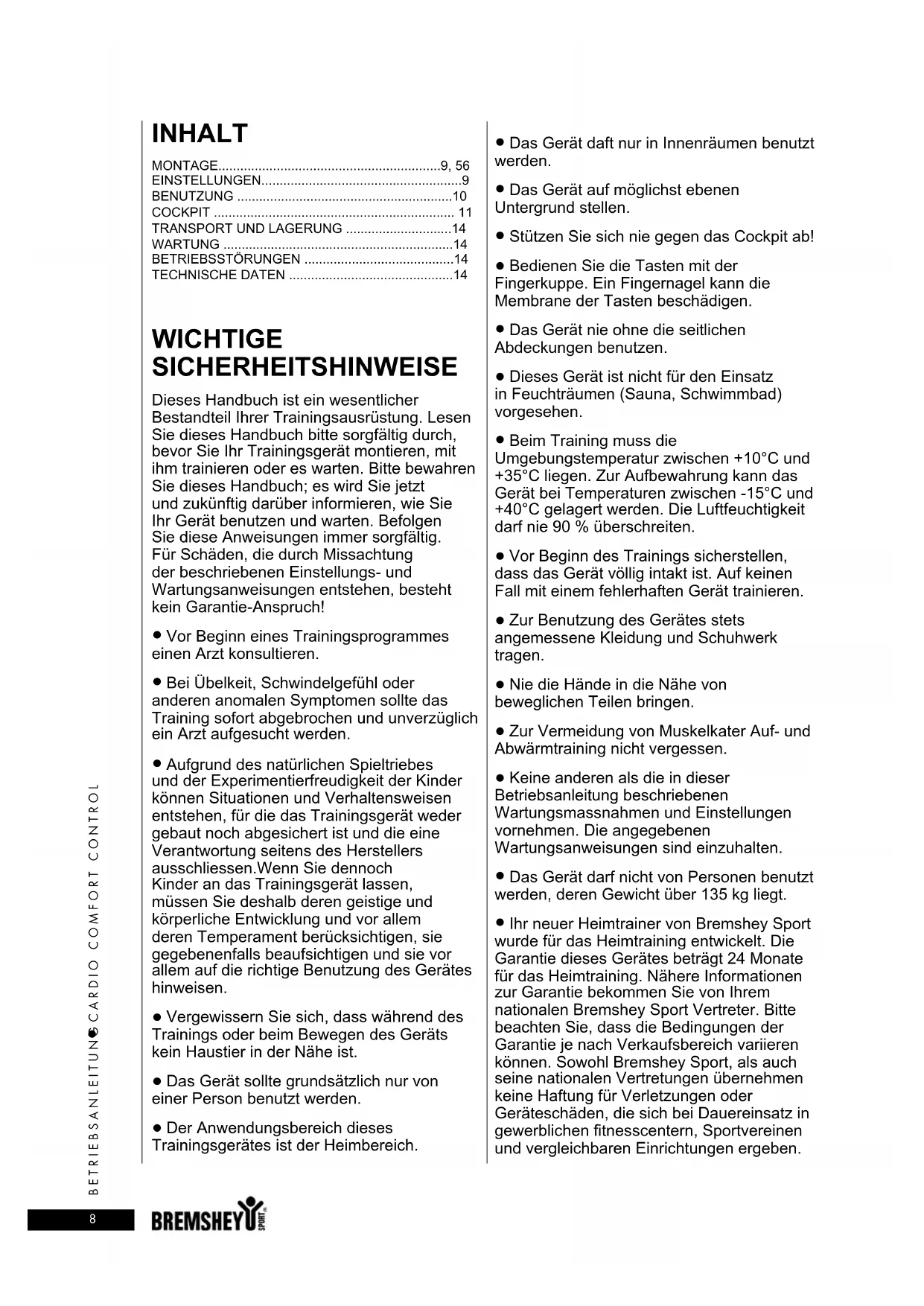 - Ihr neuer Heimtrainer von Bremshey Sport wurde für das Heimtraining entwickelt. Die Garantie these Gerätes beträgt 24 Monate für das Heimtraining. Nähere Informationen zur Garantie besteht. Sie von ihrer nationalen Bremshey Sport Vertreter.itte beachten Sie, dass die Bedingungen der Garantie je nach Verkaufsbereich variieren können. Sowohl Bremshey Sport, als auch seine nationalen Vertretungen übernehmen keine Haftung fur Verletzungen oder Geräteschäden, die sich bei Dauereinsatz in gewerblichen fitnesscentern, Sportvereinen und vergleichbaren Einrichtungen ergeben.