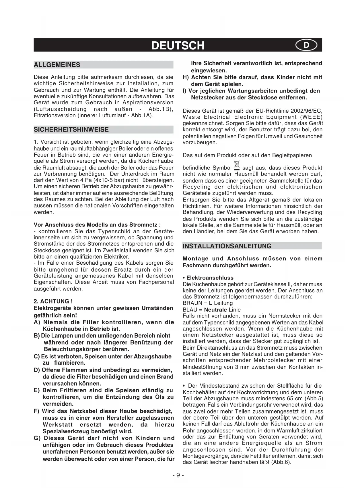 Netzstecker aus der Steckdose entfernen. Dieses Gerät ist gemäß der EU-Richtlinie 2002/96/EC, Waste Electrical Electronic Equipment (WEEE) gekennzeichnet. Sorgen Sie bitte dafür, dass das Gerät korrekt entsorgt wird, der Benutzer trägt dazu bei, den potentiellen negativen Folgen für Umwelt und Gesundheit vorzubeugen. Das auf dem Produkt oder auf den Begleitpapieren befindliche Symbol sagt aus, dass dieses Produkt nicht wie normaler Hausmüll behandelt werden darf, sondern dass es einer geeigneten Sammelstelle für das Recycling der elektrischen und elektronischen Geräteteile zugeführt werden muss. Entsorgen Sie bitte das Altgerät gemäß der lokalen Richtlinien. Für weitere Informationen hinsichtlich der Behandlung, der Wiederverwertung und des Recycling des Produkts wenden Sie sich bitte an die zuständige lokale Stelle, an die Sammelstelle für Hausmüll, oder an den Händler, bei dem Sie das Gerät erworben haben. INSTALLATIONSANLEITUNG Montage und Anschluss müssen von einem Fachmann durchgeführt werden.