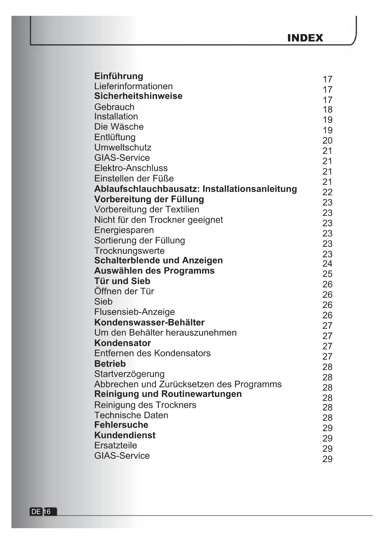 Garantieschein Energieeffizienzklasse Bitte lesen Sie diese Anleitung sorgfältig durch und richten Sie sich bei der Bedienung der Wäschetrockner an die Anleitung. Dieses Handbuch enthält wichtige Hinweise für die sichere Installation, Anwendung und Wartung sowie einige nützliche Hinweise für optimale Ergebnisse beim Gebrauch Ihrer Maschine. Heben Sie diese Dokumentation an einem sicheren Ort auf, um jederzeit wieder darauf zurückgreifen zu können bzw. um sie an zukünftige Besitzer weitergeben zu können Ⴠ Kinder unter 8 Jahren sowie Personen, die aufgrund ihrer physischen, sensorischen oder geistigen Fähigkeiten oder ihrer Unerfahrenheit oder Unkenntnis nicht in der Lage sind, die Wäschetrockner sicher zu bedienen, dürfen die Wäschetrockner nicht ohne Aufsicht oder Anweisung durch eine verantwortliche Person benutzen, sich in der Nähe aufhalten oder das Gerät saubermachen. Kinder sollten nicht mit dem Gerät spielen. Reinigung und Benutzerwartung sollten nicht von Kindern ohne Einführung, ausgeführt werden. Ⴠ WARNUNG Zweckentfremdung des Trockners kann zu Brandgefahr führen. Ⴠ Dieses Gerät ist ausschließlich für den Haushaltsgebrauch konzipiert bzw. für den haushaltsnahen Gebrauch, wie z.B: - Teeküchen für das Personal von Büros, Geschäften oder ähnlichen Arbeitsbereichen; - Ferienhäuser; - Gäste von Hotels, Motels und anderen Wohneinrichtungen; - Gäste von Apartments/Ferienwohnungen, Bed and Breakfast Einrichtungen Eine andere Nutzung als die normale Haushaltsnutzung, wie z.B. gewerbliche oder professionelle Nutzung durch Fachpersonal, ist auch im Falle der oben erwähnten Einrichtungen ausgeschlossen. Sollte das Gerät entgegen diesen Vorschriften betrieben werden, kann dies die Lebensdauer des Gerätes beeinträchtigen und den Garantieanspruch gegenüber dem Hersteller verwirken. Eventuelle Schäden am Gerät oder andere Schäden oder Verluste, die EINFÜHRUNG Liefer informationen Gebrauch SICHERHEITSHINWEISE Die Sicherheit des Geräts kann beeinträchtigt werden, wenn Sie sich nicht an diese Sicherheitshinweis e halten. Falls ein Problem mit Ihrer Maschine durch Zweckentfremdung verursacht wird, müssen Sie Reparaturarbeiten möglicherweise selbst bezahlen. Kontrollieren Sie,ob die Maschine durch den Transport beschädigt wurde.Falls dies der Fall ist, wenden Sie sich an den GIASService.