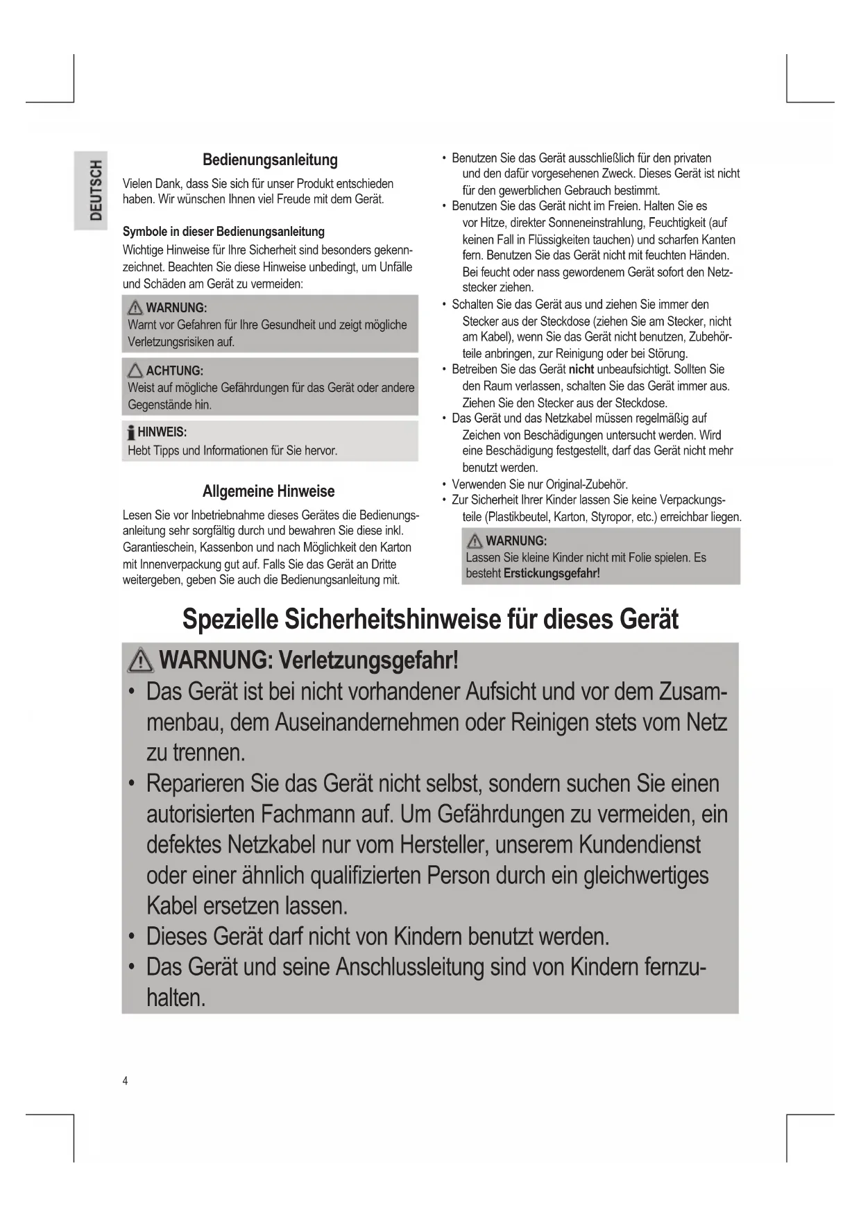 Bedienungsanleitung Vielen Dank, dass Sie sich für unser Produkt entschieden haben. Wir wünschen Ihnen viel Freude mit dem Gerät. Symbole in dieser Bedienungsanleitung Wichtige Hinweise für Ihre Sicherheit sind besonders gekenn- zeichnet. Beachten Sie diese Hinweise unbedingt, um Unfälle und Schäden am Gerät zu vermeiden: WARNUNG: Warnt vor Gefahren für Ihre Gesundheit und zeigt mögliche Verletzungsrisiken auf. ACHTUNG: Weist auf mögliche Gefährdungen für das Gerät oder andere Gegenstände hin. HINWEIS: Hebt Tipps und Informationen für Sie hervor. Allgemeine Hinweise Lesen Sie vor Inbetriebnahme dieses Gerätes die Bedienungs- anleitung sehr sorgfältig durch und bewahren Sie diese inkl. Garantieschein, Kassenbon und nach Möglichkeit den Karton mit Innenverpackung gut auf. Falls Sie das Gerät an Dritte weitergeben, geben Sie auch die Bedienungsanleitung mit. Spezielle Sicherheitshinweise für dieses Gerät WARNUNG: Verletzungsgefahr!