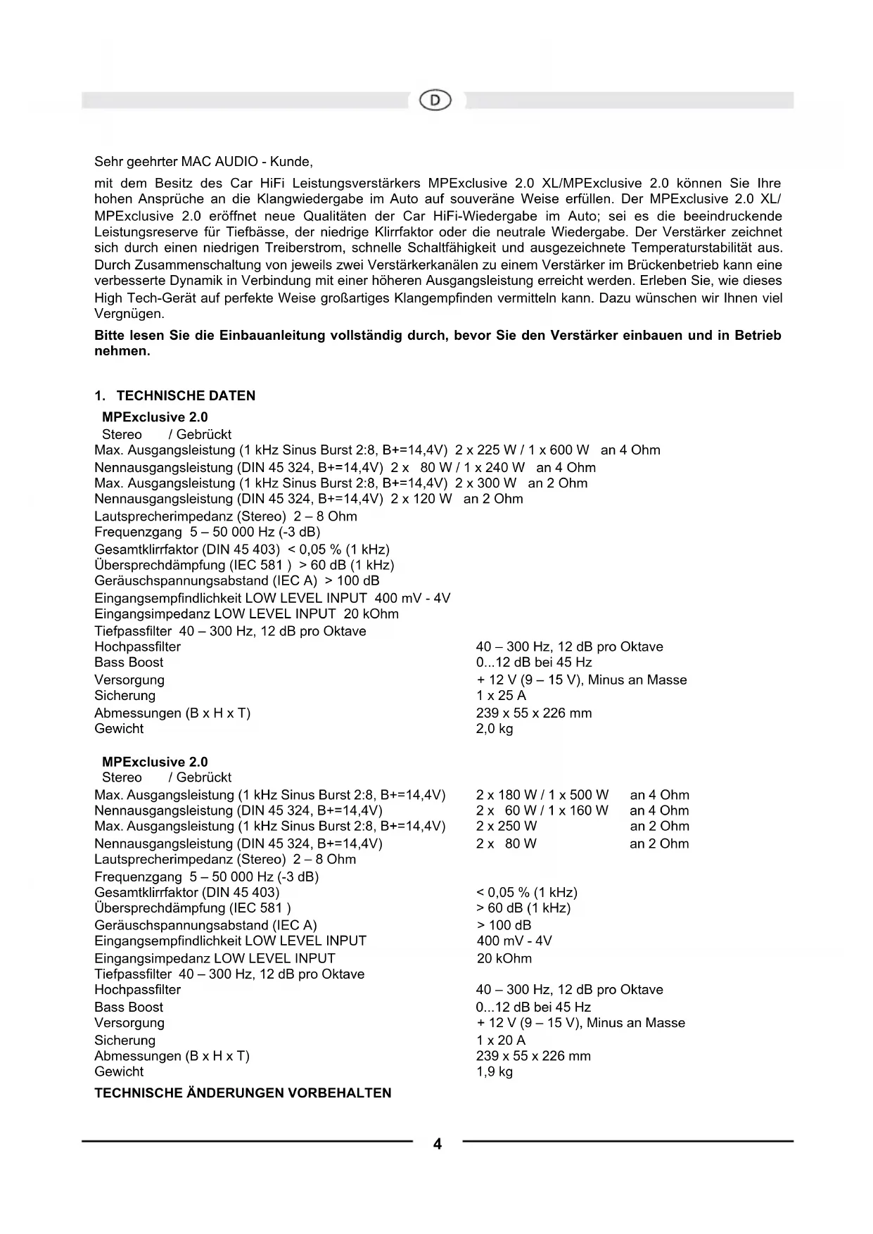 MPExclusive 2.0 Stereo / Gebrückt Max. Ausgangsleistung (1 kHz Sinus Burst 2:8, B+=14,4V) 2 x 225 W / 1 x 600 W an 4 Ohm Nennausgangsleistung (DIN 45 324, B+=14,4V) 2 x 80 W / 1 x 240 W an 4 Ohm Max. Ausgangsleistung (1 kHz Sinus Burst 2:8, B+=14,4V) 2 x 300 W an 2 Ohm Nennausgangsleistung (DIN 45 324, B+=14,4V) 2 x 120 W an 2 Ohm Lautsprecherimpedanz (Stereo) 2 – 8 Ohm Frequenzgang 5 – 50 000 Hz (-3 dB) Gesamtklirrfaktor (DIN 45 403) < 0,05 % (1 kHz) Übersprechdämpfung (IEC 581 ) > 60 dB (1 kHz) Geräuschspannungsabstand (IEC A) > 100 dB Eingangsempndlichkeit LOW LEVEL INPUT 400 mV - 4V Eingangsimpedanz LOW LEVEL INPUT 20 kOhm Tiefpasslter 40 – 300 Hz, 12 dB pro Oktave Hochpasslter 40 – 300 Hz, 12 dB pro Oktave Bass Boost 0...12 dB bei 45 Hz Versorgung + 12 V (9 – 15 V), Minus an Masse Sicherung 1 x 25 A Abmessungen (B x H x T) 239 x 55 x 226 mm Gewicht 2,0 kg MPExclusive 2.0 Stereo / Gebrückt Max. Ausgangsleistung (1 kHz Sinus Burst 2:8, B+=14,4V) 2 x 180 W / 1 x 500 W an 4 Ohm Nennausgangsleistung (DIN 45 324, B+=14,4V) 2 x 60 W / 1 x 160 W an 4 Ohm Max. Ausgangsleistung (1 kHz Sinus Burst 2:8, B+=14,4V) 2 x 250 W an 2 Ohm Nennausgangsleistung (DIN 45 324, B+=14,4V) 2 x 80 W an 2 Ohm Lautsprecherimpedanz (Stereo) 2 – 8 Ohm Frequenzgang 5 – 50 000 Hz (-3 dB) Gesamtklirrfaktor (DIN 45 403) < 0,05 % (1 kHz) Übersprechdämpfung (IEC 581 ) > 60 dB (1 kHz) Geräuschspannungsabstand (IEC A) > 100 dB Eingangsempfindlichkeit LOW LEVEL INPUT 400 mV - 4V Eingangsimpedanz LOW LEVEL INPUT 20 kOhm Tiefpassfilter 40 – 300 Hz, 12 dB pro Oktave Hochpasslter 40 – 300 Hz, 12 dB pro Oktave Bass Boost 0...12 dB bei 45 Hz Versorgung + 12 V (9 – 15 V), Minus an Masse Sicherung 1 x 20 A Abmessungen (B x H x T) 239 x 55 x 226 mm Gewicht 1,9 kg
