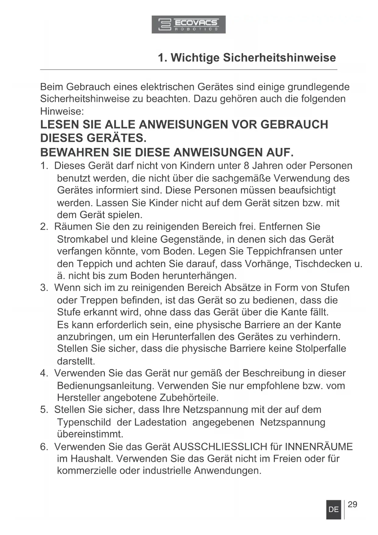 Herzlichen Glückwunsch zum Kauf Ihres neuen DEEBOT von ECOVACS ROBOTICS! Wir hoffen, dass er viele Jahre lang zu Ihrer vollen Zufriedenheit arbeiten wird. Wir sind sicher, dass er Ihnen dabei helfen wird, Ihr Zuhause sauber zu halten, während Sie Ihre wertvolle Zeit für die angenehmen Dinge im Leben nutzen. Live Smart. Enjoy Life. Sollte n Sie mit ein er Situatio n konfronti ert sei n, d ie in diese r Bedienungsanleitung nicht ausreichend behandelt wird, wenden Sie sich an das Kundenservicecenter, damit sich ein Techniker mit Ihrem speziellen Problem bzw. Ihrer Frage befassen kann. Weitere Informationen finden Sie auch auf der offiziellen Webseite von ECOVACS ROBOTICS: www.ecovacs.com Technische und gestalterische Änderungen sind im Zuge der kontinuierlichen Produktverbesserung vorbehalten. Vielen Dank, dass Sie sich für den DEEBOT entschieden haben!28