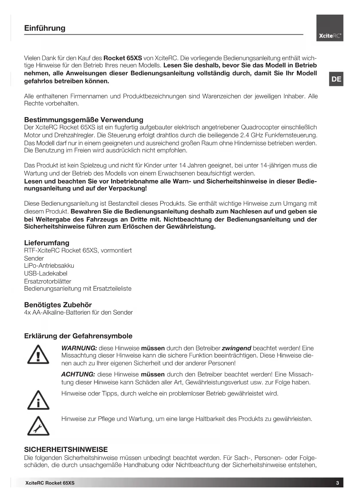 Vielen Dank für den Kauf des Rocket 65XS von XciteRC. Die vorliegende Bedienungsanleitung enthalt wichtige Hinweise für den Betrieb Ihrnes neuen Modells. Lesen Sie deshalb, bevor Sie das Modell in Betriebnehmen, alle Anweisungen dieser Bedienungsanleitung vollständig durch, damit Sie Ihr Modell gefahrlos betreiben können.