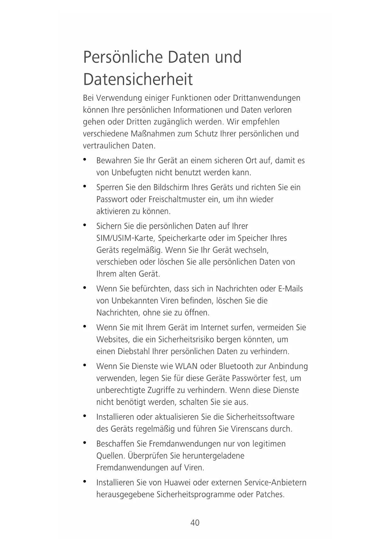 | Sicherheit | Verwenden Sie ein Passwort oder Muster zum Entsperren des Geräts, aktivieren Sie die Datenverschlüsselung. |