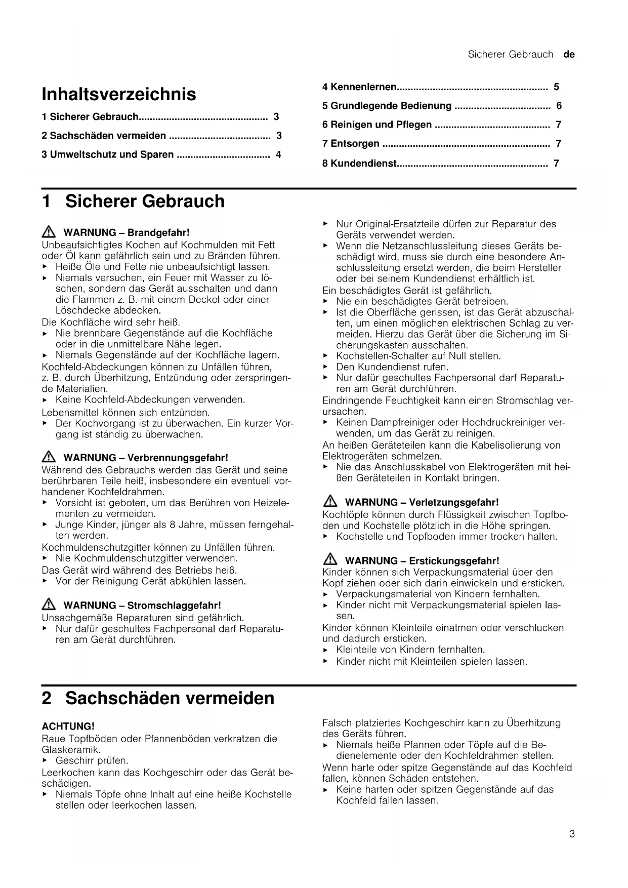 - 8 Kundendienst 1 Sicherer Gebrauch WARNUNG‒Brandgefahr! Unbeaufsichtigtes Kochen auf Kochmulden mit Fett oder Öl kann gefährlich sein und zu Bränden führen. p. 7