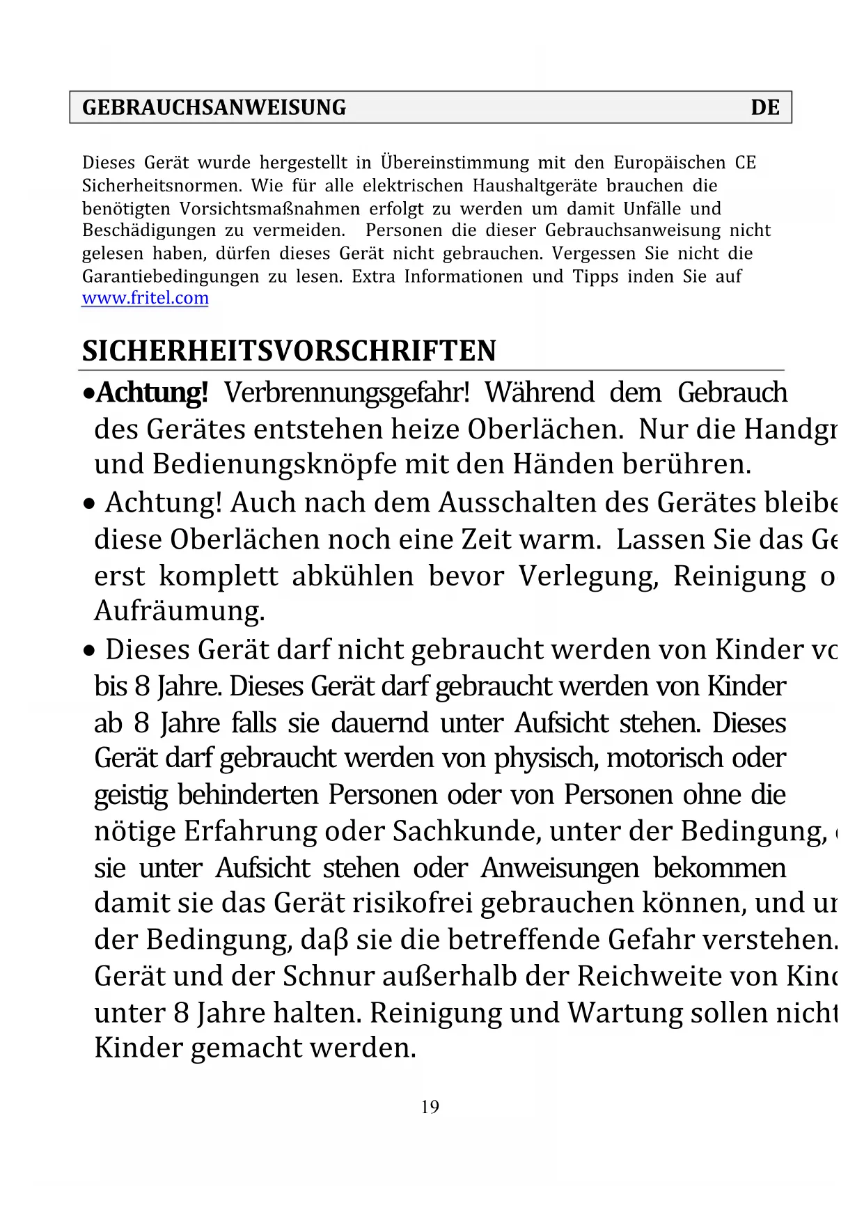 Dieses Gerät wurde hergestellt in Übereinstimmung mit den Europäischen CE Sicherheitsnormen. Wie für alle elektrischen Haushaltgeräte brauchen die benötigten Vorsichtsmaßnahmen erfolgt zu werden um damit Unfälle und Beschädigungen zu vermeiden. Personen die dieser Gebrauchsanweisung nicht gelesen haben,)dürfen these Gerät nicht gebrauchen.Vergessen Sie nicht die Garantiebedingungen zu setzen. Extra Informationen und Tipps inden Sie auf www.fritel.com