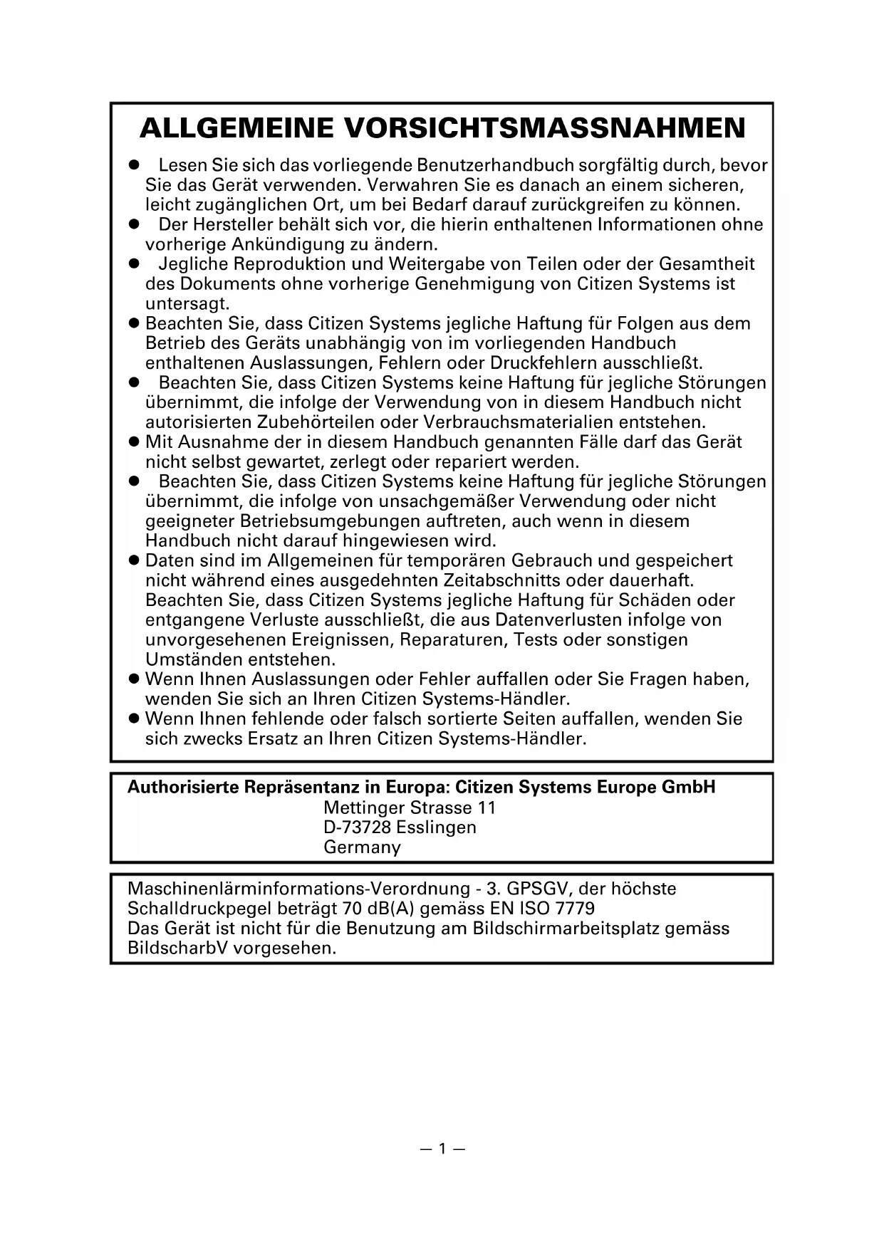 MSW10-6 Buzzer Sound Tone 2 Tone 1, Tone 2, Tone 3, Tone 4 MSW13-1 Security/Target Low/All Low/All, Mid/All, Mid/Paired only, Hi/All, Hi/ Paired only MSW13-5 BT Device Scan Discoverable No Response, Discoverable MSW13-6 Auto Reconnect Valid Invalid, Valid No du commutateur Fonction Réglage initial Valeur régléeDEUTSCH—1— ALLGEMEINE VORSICHTSMASSNAHMEN Lesen Sie sich das vorliegende Benutzerhandbuch sorgfältig durch, bevor Sie das Gerät verwenden. Verwahren Sie es danach an einem sicheren, leicht zugänglichen Ort, um bei Bedarf darauf zurückgreifen zu können. Der Hersteller behält sich vor, die hierin enthaltenen Informationen ohne vorherige Ankündigung zu ändern. Jegliche Reproduktion und Weitergabe von Teilen oder der Gesamtheit des Dokuments ohne vorherige Genehmigung von Citizen Systems ist untersagt. Beachten Sie, dass Citizen Systems jegliche Haftung für Folgen aus dem Betrieb des Geräts unabhängig von im vorliegenden Handbuch enthaltenen Auslassungen, Fehlern oder Druckfehlern ausschließt. Beachten Sie, dass Citizen Systems keine Haftung für jegliche Störungen übernimmt, die infolge der Verwendung von in diesem Handbuch nicht autorisierten Zubehörteilen oder Verbrauchsmaterialien entstehen. Mit Ausnahme der in diesem Handbuch genannten Fälle darf das Gerät nicht selbst gewartet, zerlegt oder repariert werden. Beachten Sie, dass Citizen Systems keine Haftung für jegliche Störungen übernimmt, die infolge von unsachgemäßer Verwendung oder nicht geeigneter Betriebsumgebungen auftreten, auch wenn in diesem Handbuch nicht darauf hingewiesen wird. Daten sind im Allgemeinen für temporären Gebrauch und gespeichert nicht während eines ausgedehnten Zeitabschnitts oder dauerhaft. Beachten Sie, dass Citizen Systems jegliche Haftung für Schäden oder entgangene Verluste ausschließt, die aus Datenverlusten infolge von unvorgesehenen Ereignissen, Reparaturen, Tests oder sonstigen Umständen entstehen. Wenn Ihnen Auslassungen oder Fehler auffallen oder Sie Fragen haben, wenden Sie sich an Ihren Citizen Systems-Händler. Wenn Ihnen fehlende oder falsch sortierte Seiten auffallen, wenden Sie sich zwecks Ersatz an Ihren Citizen Systems-Händler. Authorisierte Repräsentanz in Europa: Citizen Systems Europe GmbH Mettinger Strasse 11 D-73728 Esslingen Germany Maschinenlärminformations-Verordnung - 3. GPSGV, der höchste Schalldruckpegel beträgt 70 dB(A) gemäss EN ISO 7779 Das Gerät ist nicht für die Benutzung am Bildschirmarbeitsplatz gemäss BildscharbV vorgesehen.—2— "Made for iPod," "Made for iPhone," and "Made for iPad" mean that an electronic accessory has been designed to connect specifically to iPod, iPhone, or iPad, respectively, and has been certified by the developer to meet Apple performance standards. Apple is not responsible for the operation of this device or its compliance with safety and regulatory standards. Please note that the use of this accessory with iPod, iPhone or iPad may affect wireless performance. iPad, iPhone and iPod touch are trademarks of Apple Inc., registered in the U.S. and other countries. iPad Air and iPad mini are trademarks of Apple Inc. EPSON and ESC/POS are registered trademarks of Seiko Epson Corporation. QR Code is a registered trademark of DENSO WAVE INCORPORATED. Ethernet is a registered trademark of Fuji Xerox Corporation. Bluetooth